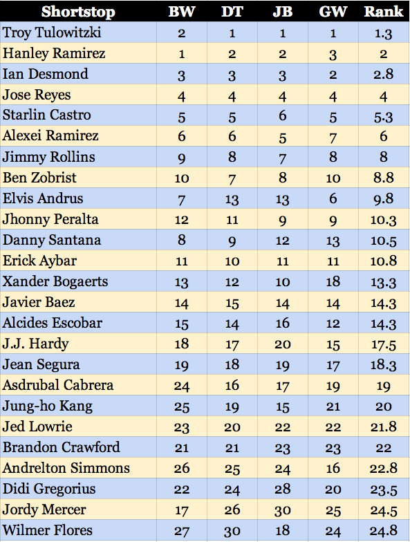 theScore's 2015 fantasy rankings apply to standard 10-team, 5x5 rotisserie leagues. Our MLB editors - Jonah Birenbaum, Dan Toman, Greg Warren and Brandon Wile - ranked 40 shortstops and the top 25 are listed below. Check out all of theScore's fantasy content for the upcoming season here.