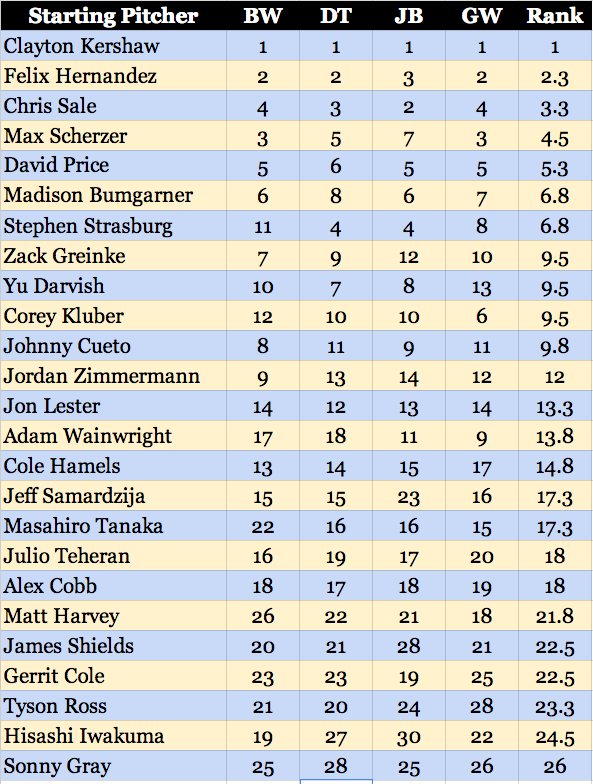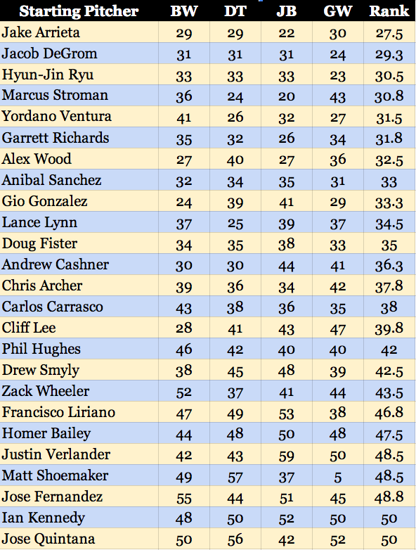 theScore's 2015 fantasy rankings apply to standard 10-team, 5x5 rotisserie leagues. Our MLB editors - Jonah Birenbaum, Dan Toman, Greg Warren and Brandon Wile - ranked 70 starting pitchers and the top 50 are listed below. Check out all of theScore's fantasy content for the upcoming season here.