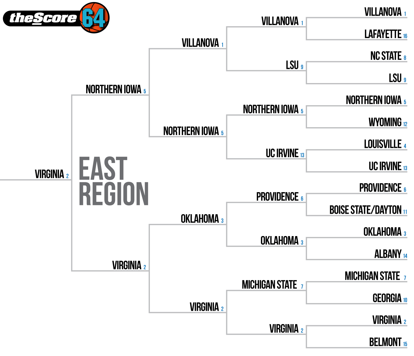 There was some concern that Villanova would be overlooked when the No. 1 seeds were handed out despite winning its final 15 games. Now that it's happened, the Wildcats look vulnerable. ... Virginia may have missed out on a No. 1 seed, but riding alongside Villanova and Oklahoma isn't all bad. ... If Northern Iowa's schedule set up a little differently, there's a conceivable chance it could be a No. 2 or 3 seed. The Panthers didn't stand a chance with what they were walking into at Wichita State on Feb. 28. With no true road games in their way now, watch out. ... Louisville hasn't scored more than 60 points against a tournament team since Valentine's Day. ... Michigan State may have ousted Virginia a year ago, but Tom Izzo doesn't have the horses to work with that he did then. ... One would have to be a real fan of the game to appreciate a Virginia-Northern Iowa matchup in the Final Four.