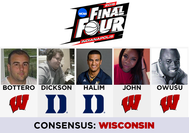 Owusu: In slaying college basketball's dragon, Wisconsin showed that it is the team to beat. The experience, length and outside shooting ability of the Badgers will not only match up well against Duke, but expect the combination of Kaminsky, Dekker and Nigel Hayes to impose their will Monday. Wisconsin 78, Duke 71
