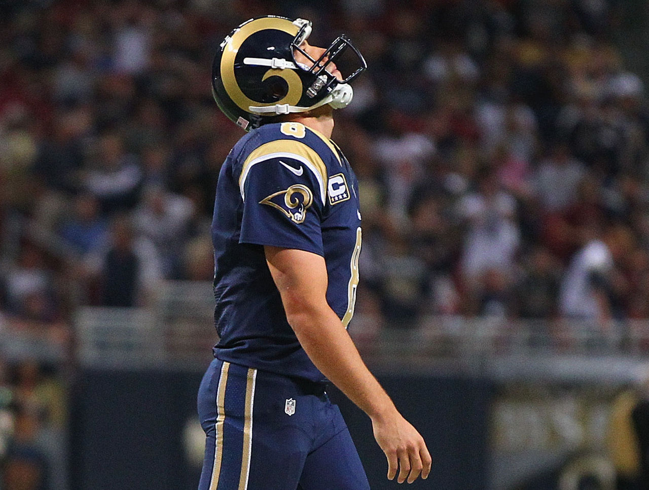 Bradford looks to the heavens, or, in this case, the majestic sight that is the roof of the Edward Jones Dome. He'll have the luxury of playing outdoors this year in Philadelphia, and thus, a better view after a pick.