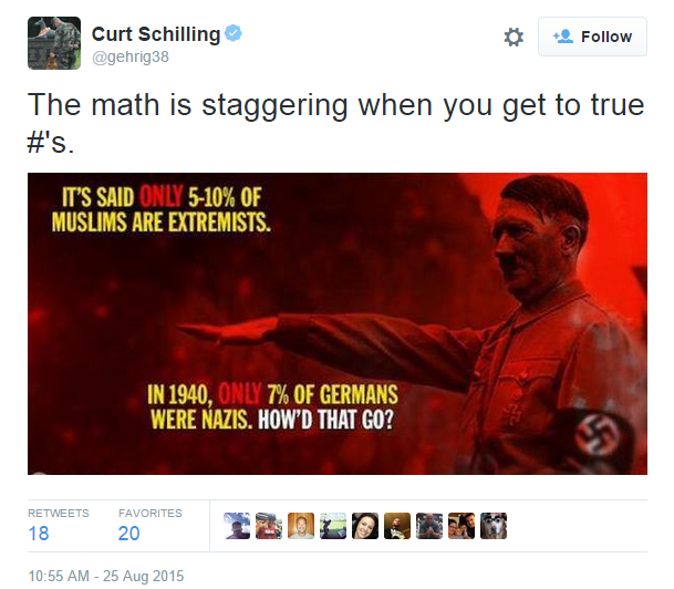 Curt Schilling, the six-time All-Star and analyst for ESPN, drew the ire of both the internet and his employer after posting (and hastily deleting) an offensive tweet Tuesday that likened Muslim extremists to Nazis.