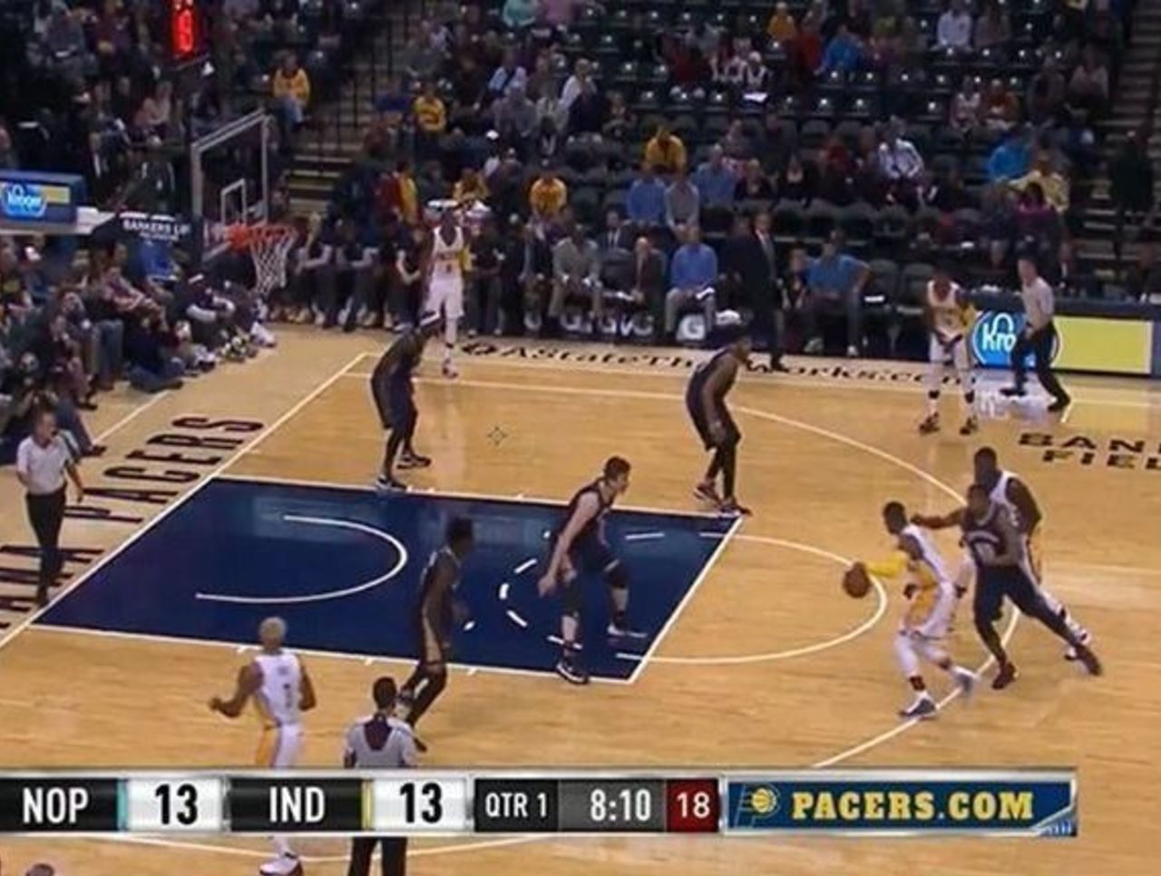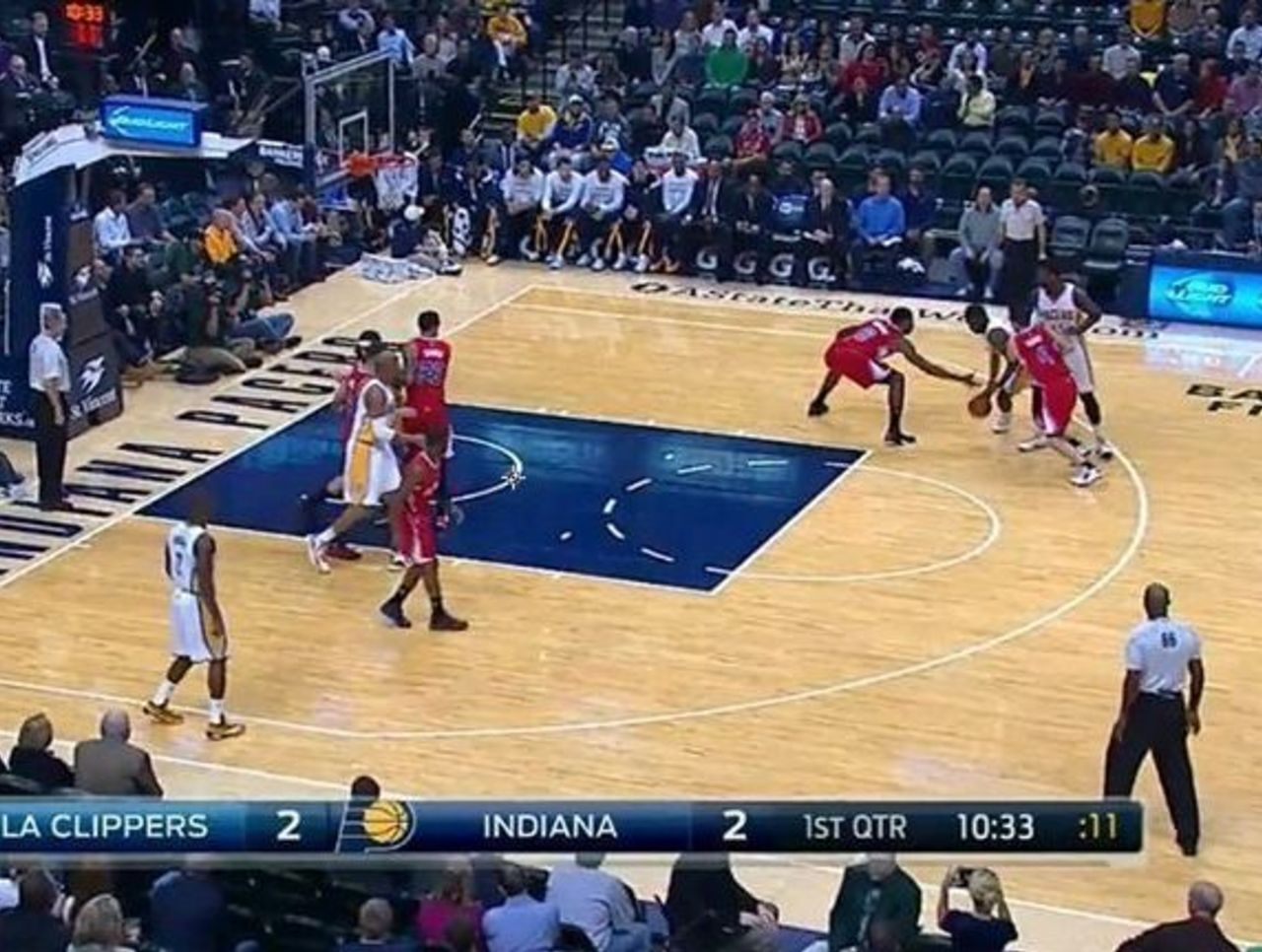 On the play below, George gets mixed up on a high pick-and-roll. He hedges high, but Davis slips. That traps George Hill on Davis, while Hill's man Eric Gordon pops open for an open 3-pointer. To make matters worse, George forgets to box-out Davis, who picks up an easy putback jam.