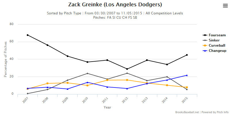 Greinke's efforts to reinvent himself yielded crazy dividends this season, as he fashioned a 1.66 ERA - the fourth-best mark since 1969 - amid further changes in his pitch usage. Relying increasingly on his four-seamer and changeup, Greinke demonstrated unprecedented command in 2015, posting the lowest walk rate of his career (4.7 percent) while allowing just 14 home runs in 222 2/3 innings. Locating his pitches with remarkable precision, Greinke notched his highest first-pitch strike rate (64.1 percent) since 2005, while inducing soft contact more frequently than all but six starters. Some of his success was fueled by a remarkably low .229 BABIP, but Greinke's combination of stuff and command, along with his highly cerebral approach to his craft, should allow him to remain among the game's top starters for the next few seasons.
