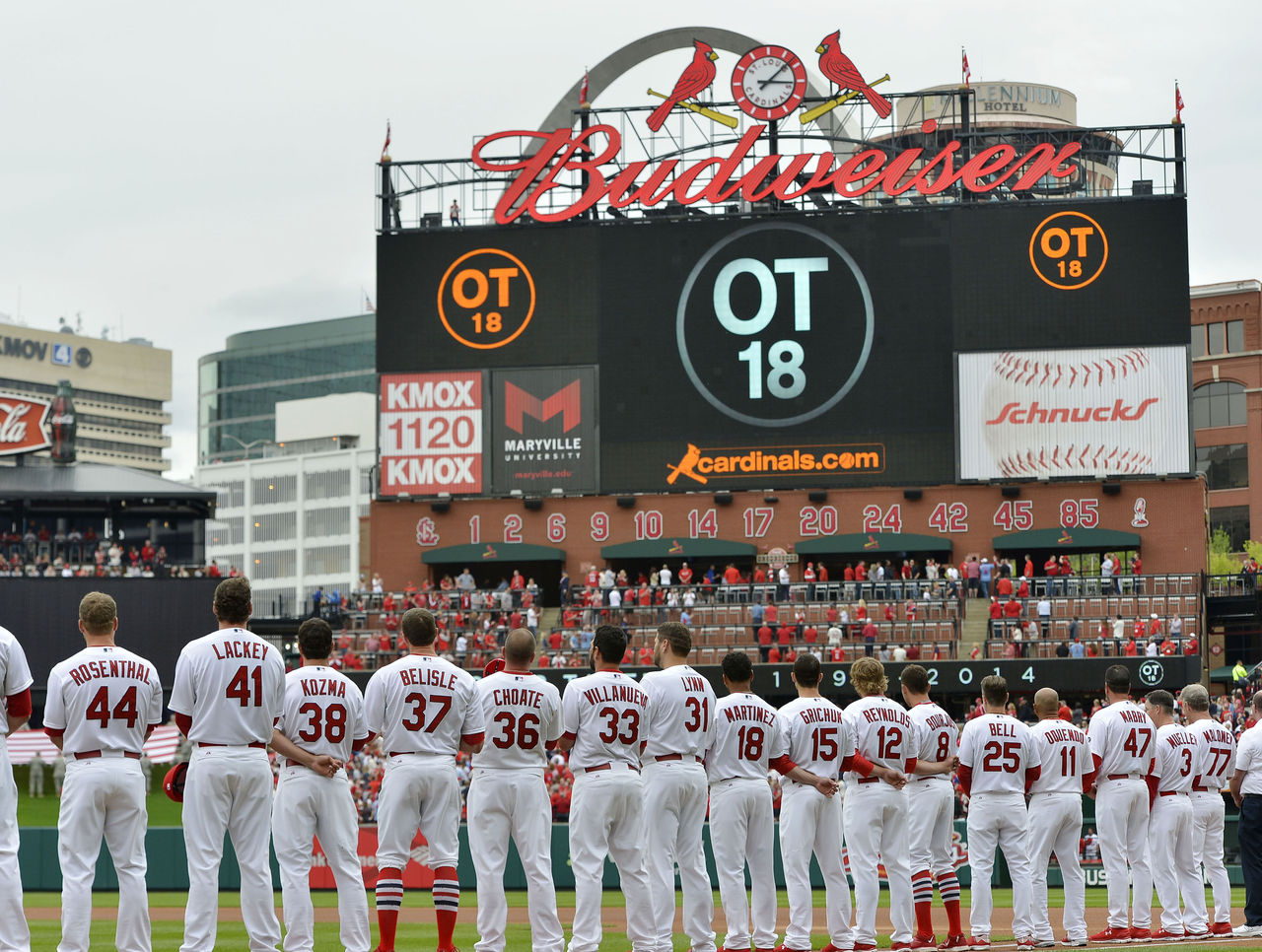 April 13 - Members of the Cardinals line up on Opening Day to memorialize teammate Oscar Taveras, who died in a car accident in October.