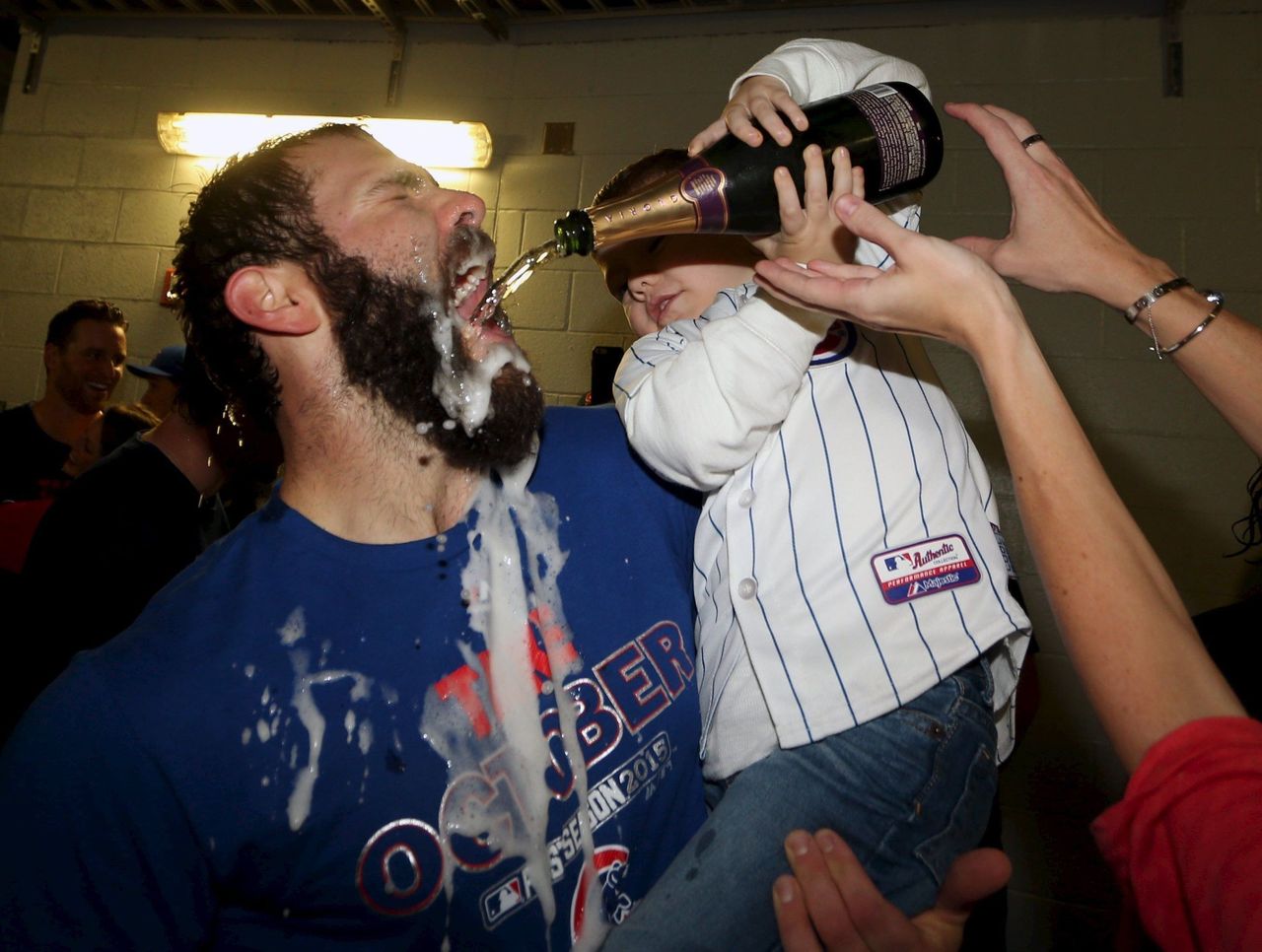 Oct 7 - Jake Arrieta receives a celebratory drink from his son, Cooper, after knocking off the Pirates in the NL wild-card game.