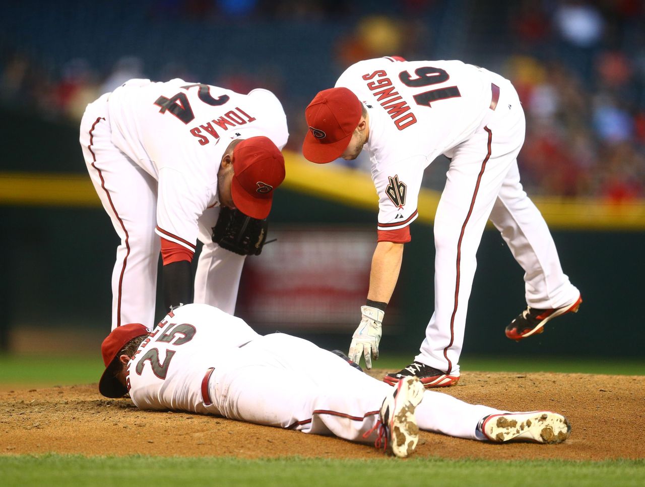 April 28 - Teammates come to the aid of starter Archie Bradley after the right-hander is hit in the face by a line drive.