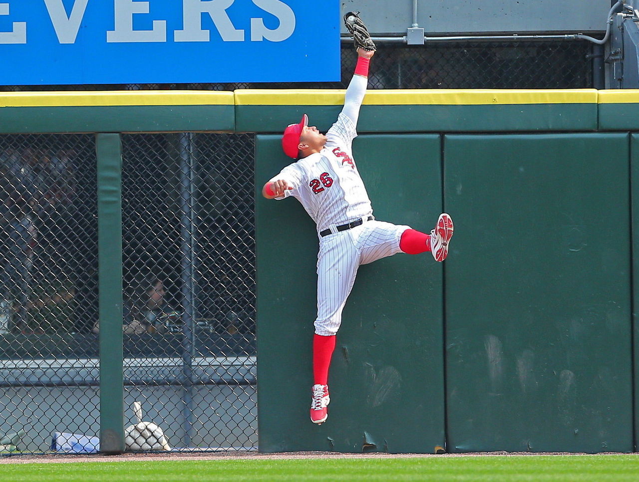 July 26 - Odubel Herrera makes a dramatic diving catch on the warning track to preserve Cole Hamels' no-hitter against the Cubs.
