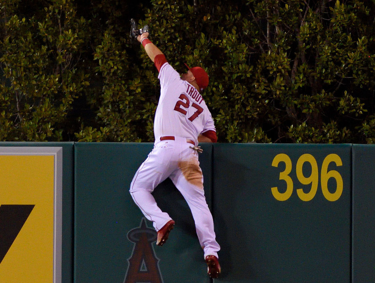 Sept 26 - Mike Trout proves his game has no limitations, hanging onto the wall to make a spectacular catch to rob Jesus Montero of a three-run homer.