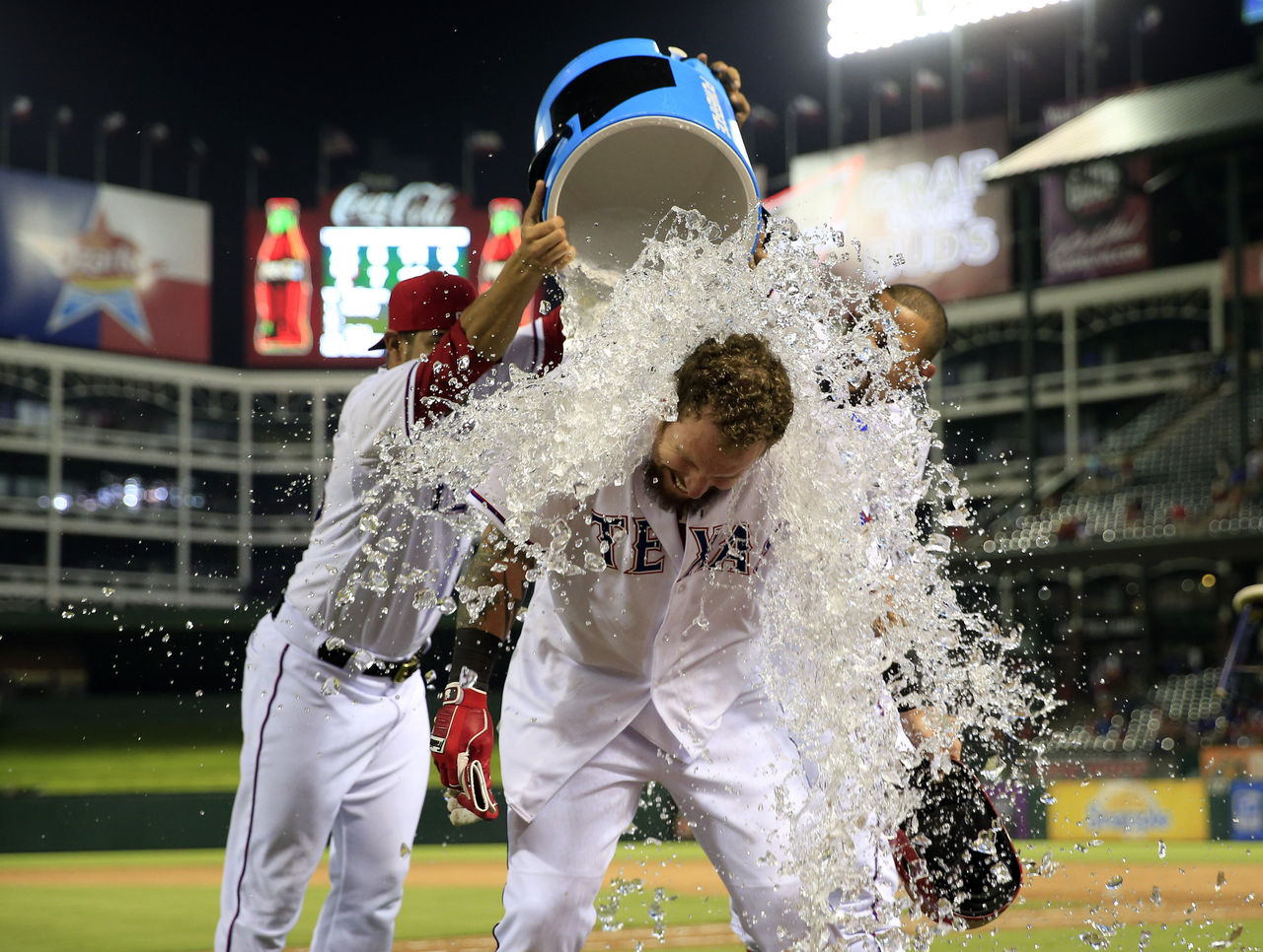 July 30 - Josh Hamilton gets a Gatorade bath from teammates after hitting a walk-off single to beat the Yankees.
