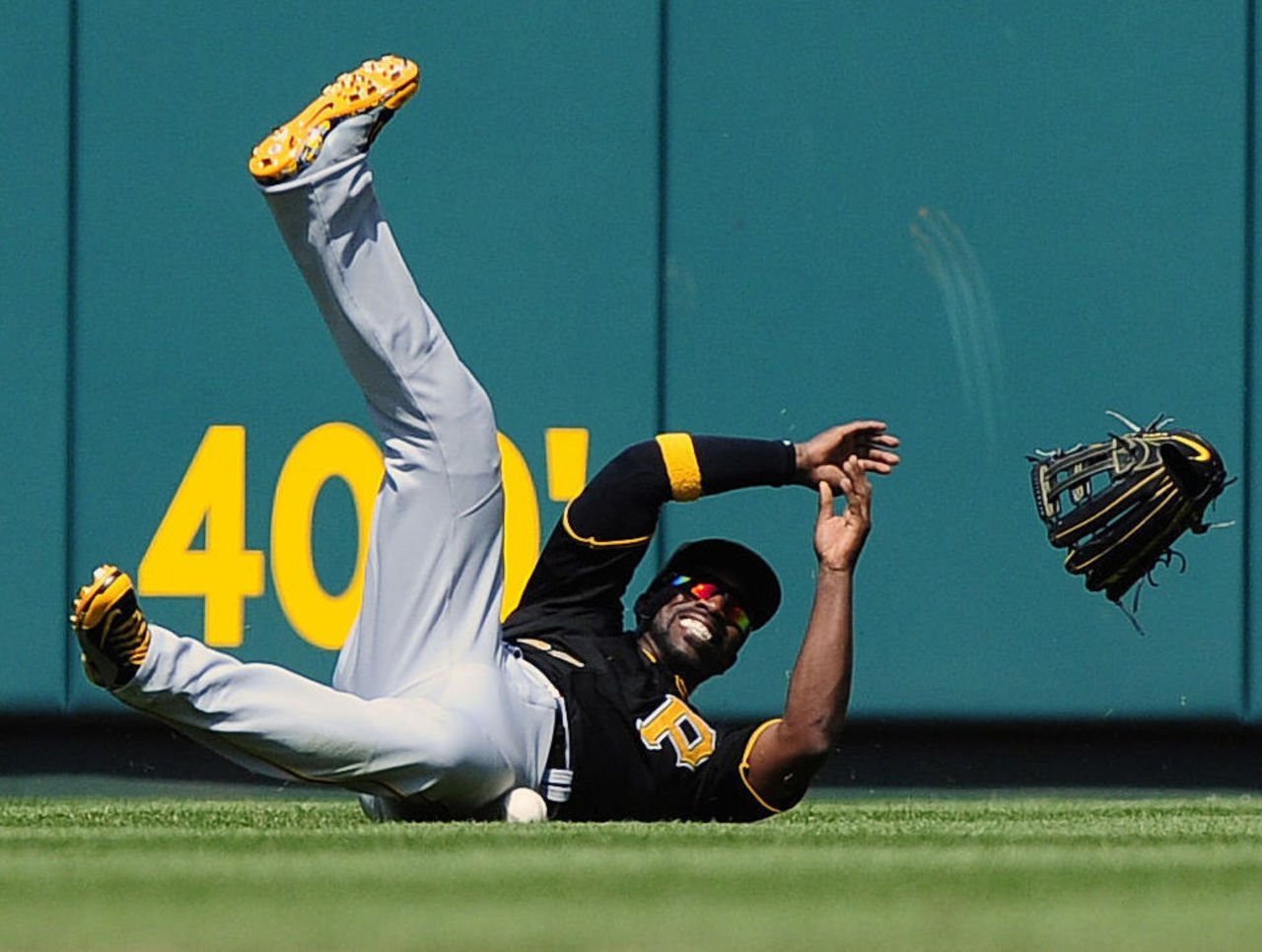 May 3 - Andrew McCutchen is unable to come up with a catch against the Cardinals - a rare misplay for the five-time All-Star.
