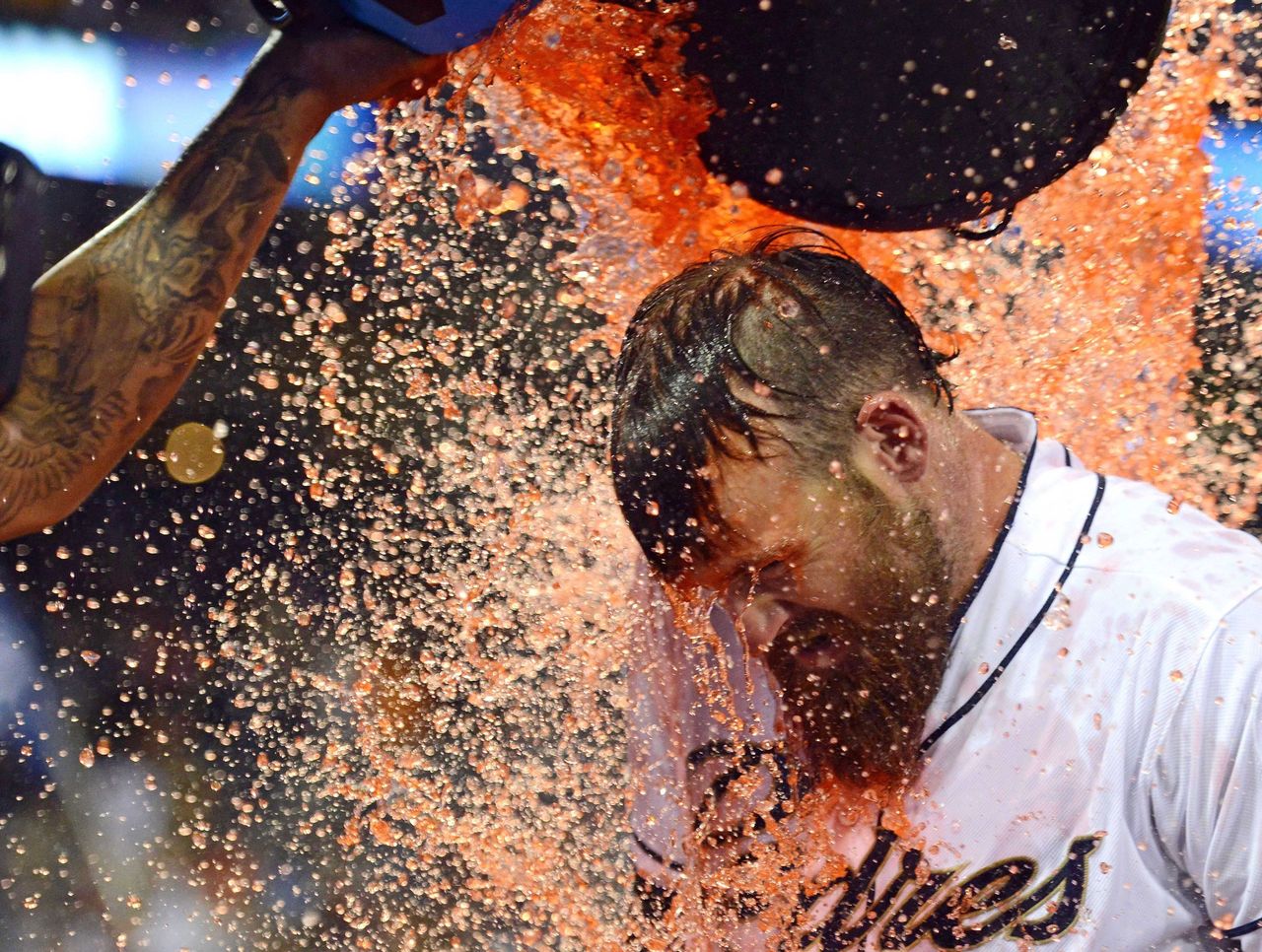 May 29 - Padres catcher Derek Norris has Gatorade dumped on him after hitting a walk-off grand slam to beat the Pirates.