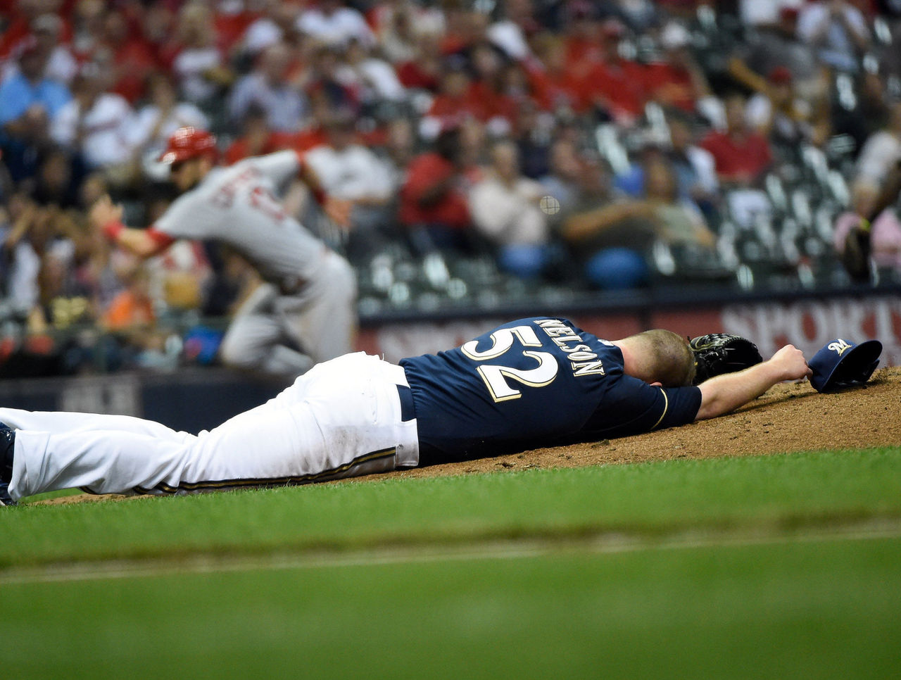 Sept 17 - Jimmy Nelson lays on the mound after taking a 108-mph line drive off the head. A CT scan revealed only a contusion.
