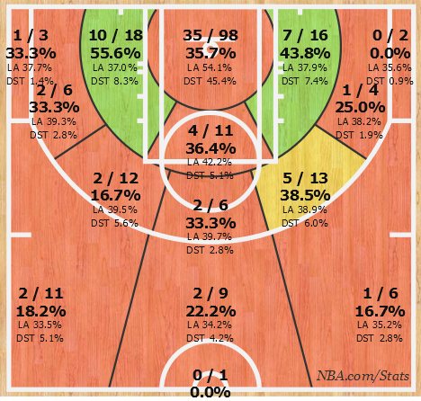 His struggles worsen when he turns to the jumpshot. Rose is shooting an abysmal 25 percent on catch-and-shoot jumpers, and his average of 34.8 percent on pullups are hardly any better, which makes for an extremely unsightly shooting chart.