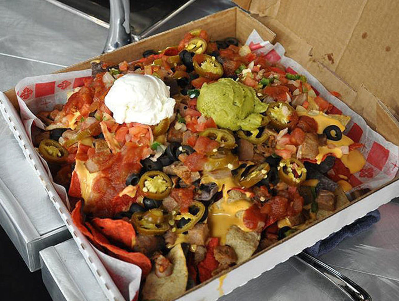 Slow-roasted pork, steak, and chicken are seasoned with a spice blend that features local chiles, along with all the nacho fixings a fan could want - guacamole, jalapenos, olives, pico de gallo, and sour cream.
