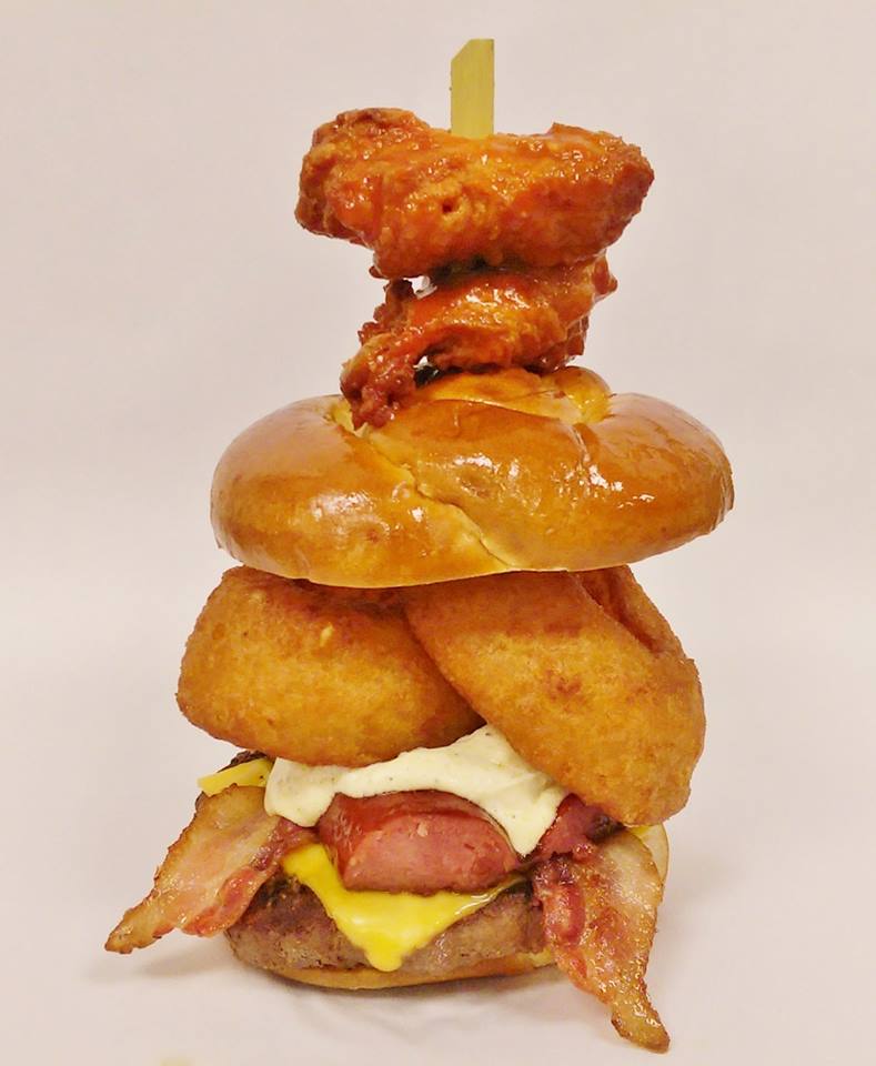 "The Tailgater Burger" is made up of a grass-fed beef patty topped with cheese, bacon, kielbasa sausage, Maryland crab dip, and beer-battered onion rings on a pretzel roll. Then it's topped with a couple buffalo chicken wings for good measure.