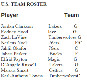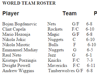 Minnesota Timberwolves rookies Karl-Anthony Towns and Andrew Wiggins, along with first-year New York Knicks forward Kristaps Porzingis, headline the rosters for the U.S. Team and World Team, respectively.