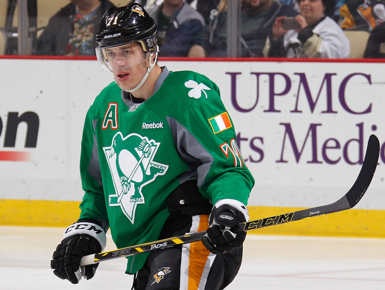 Sidney Crosby (Crosbaigh) and Evgeni Malkin (Maolchin), along with the rest of their Penguins teammates, wore the jerseys prior to a game against the Boston Bruins, with their names written in Gaelic calligraphy on the backs.