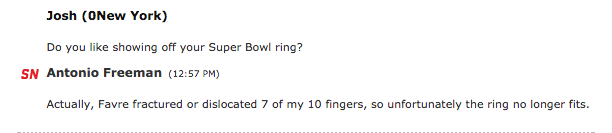 While chatting with ESPN's SportsNation on Tuesday, Freeman revealed the ring no longer fits because the majority of his fingers were broken or dislocated as a result of catching passes from Brett Favre.