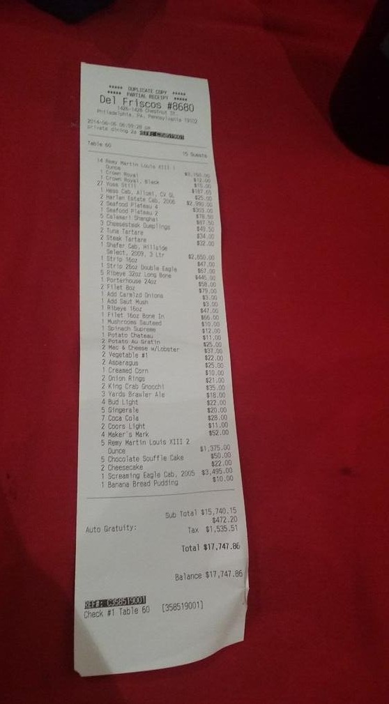 That's $17,747.86 worth of steak, wine, champagne and a whole lot more.