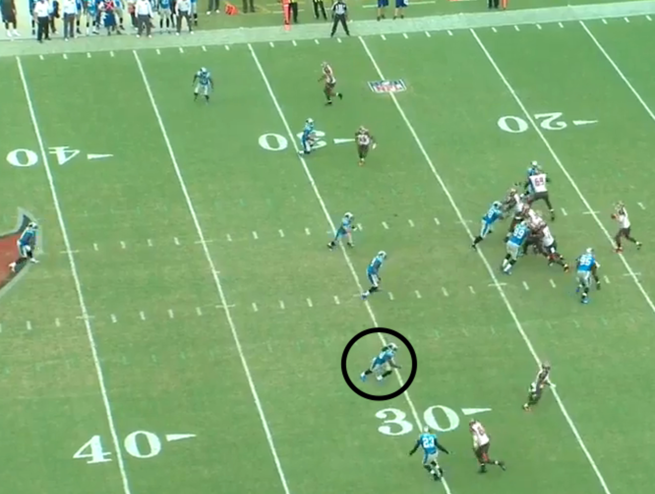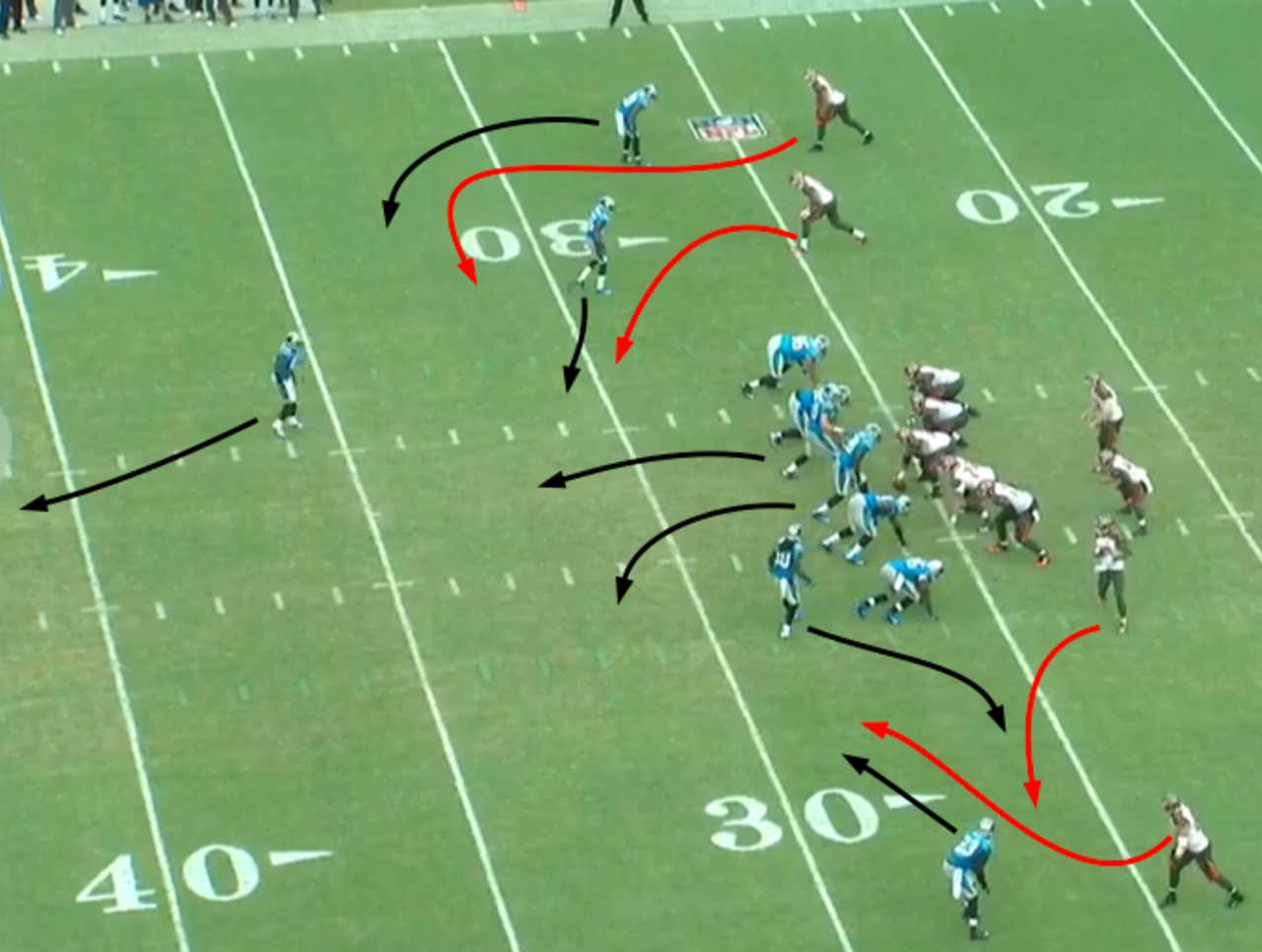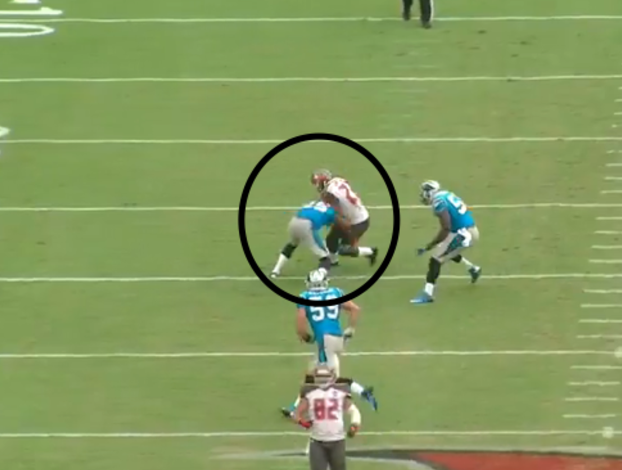 The Panthers showed two-deep coverage against the Bucs’ trips right on third-and-2. As the clock ticked away, Godfrey walked down to the line and inside the right defensive end and showed blitz, creating a single-high look deep. But the Bucs motioned their No. 3 receiver across the formation. The motion was an indicator of a quick flat route. Godfrey was aware of it and immediately walked away from the line and inside the receiver.