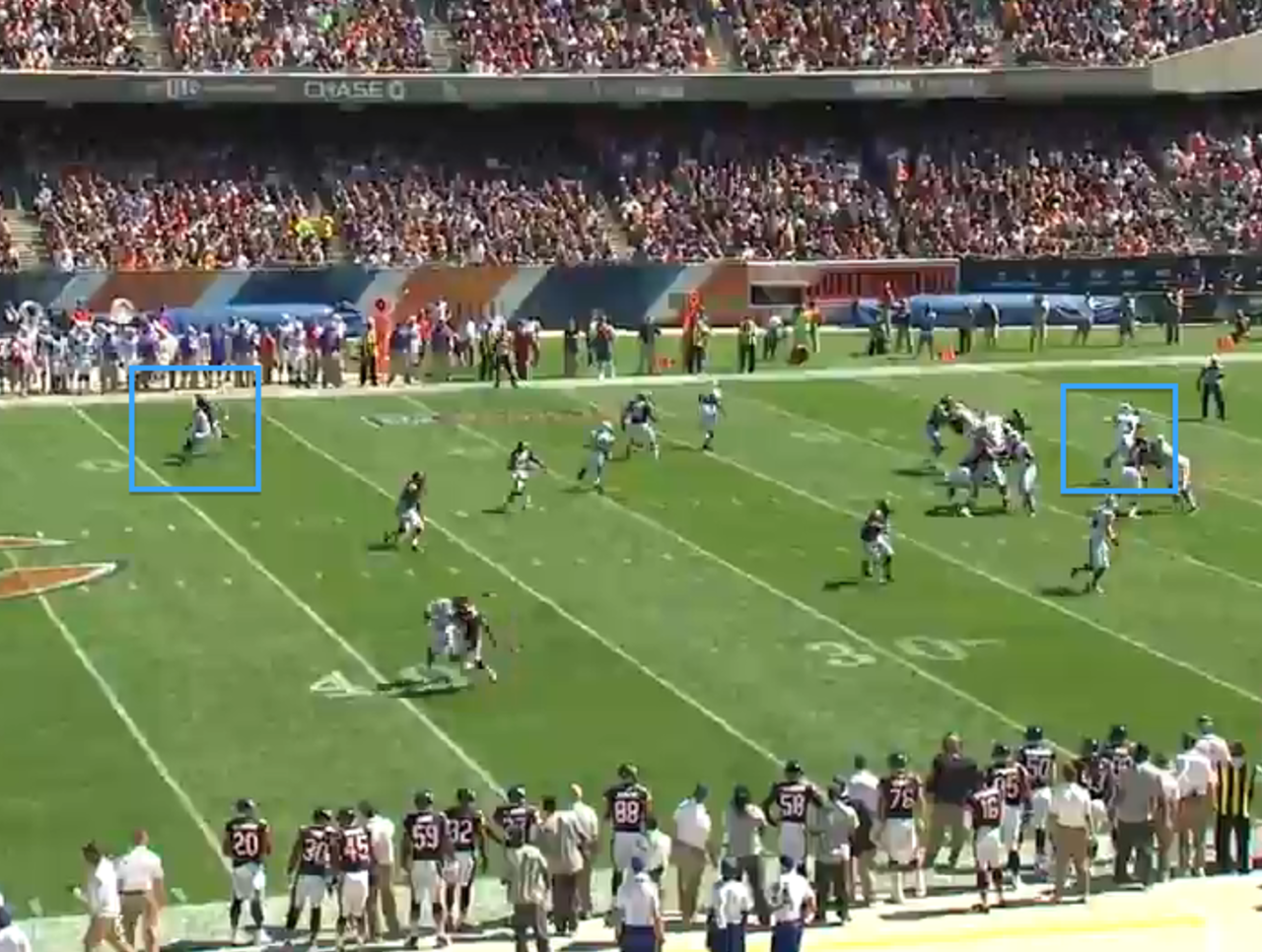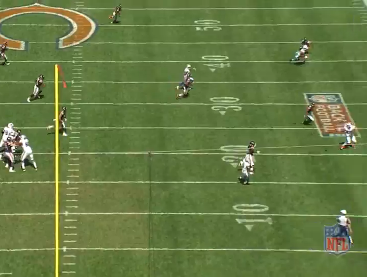 In Week 1 against the Chicago Bears, Manuel play-faked and rolled out to his right in the first quarter. He had three pass catchers to that side. One was Robert Woods running a shallow crossing route, another was Sammy Watkins running a comeback route, and underneath was Frank Summers running a flat route.