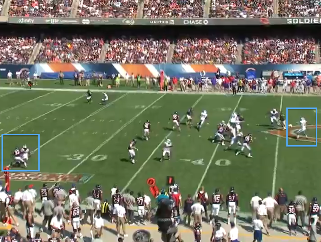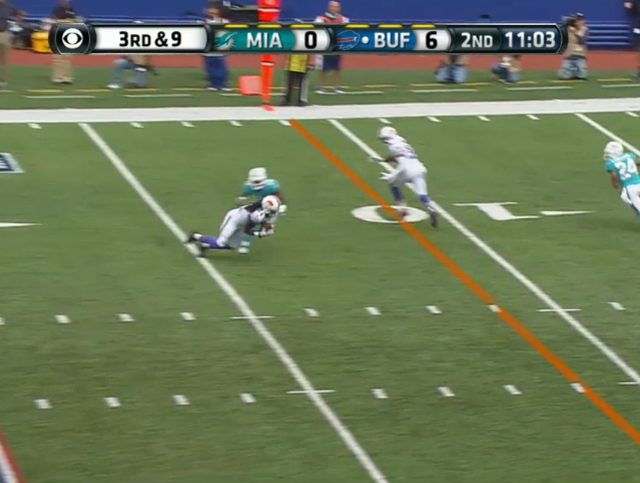 The pass came out low and took a nosedive as it traveled across the field, forcing Watkins to dive and catch it despite having room to run. The recovering cornerback touched him down four yards behind the marker and the Bills were forced to kick a field goal.