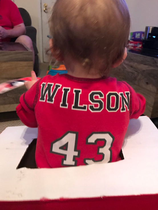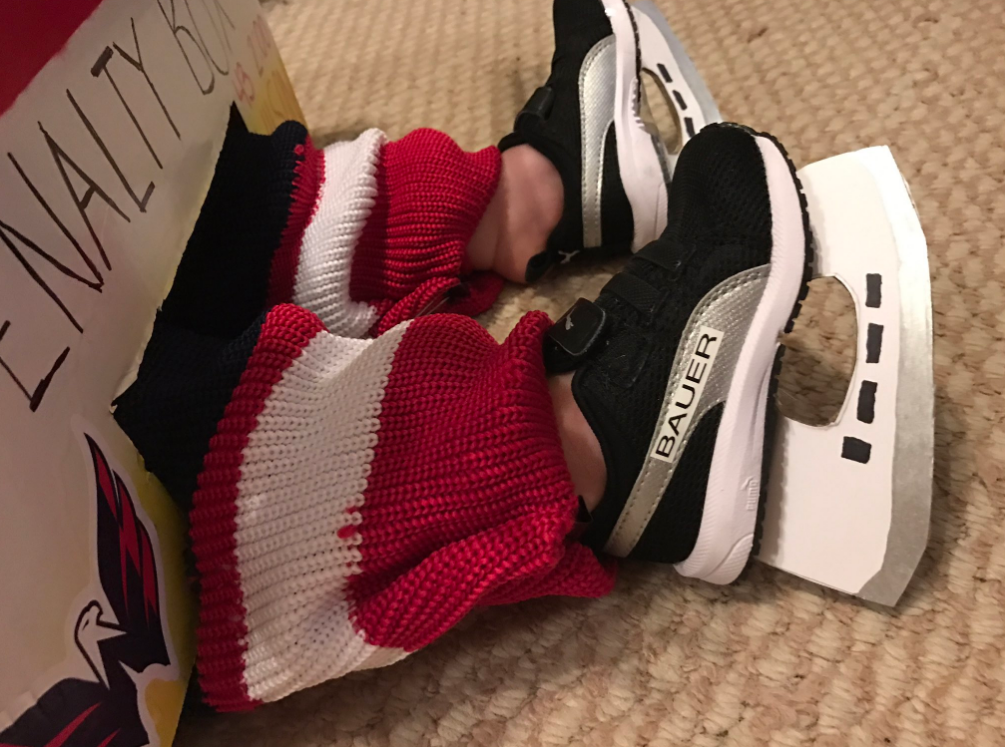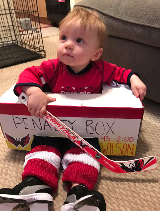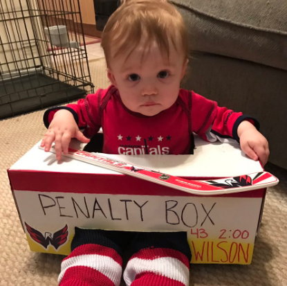 A Washington Capitals fan dressed her young child up as Tom Wilson in a penalty box for Halloween.