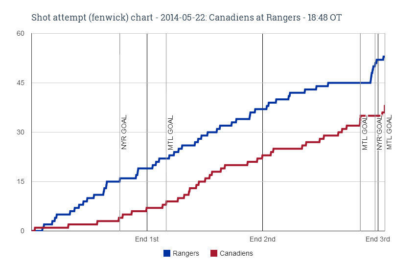 As the chart posted above demonstrates, the Rangers "deserved" to win if you look at which team had the most attempts on net. As such, the game appeared to be trending ever in their favor, until it wasn't. Galchenyuk's goal in overtime, therefore, proved to be the ultimate turning point (of no return).