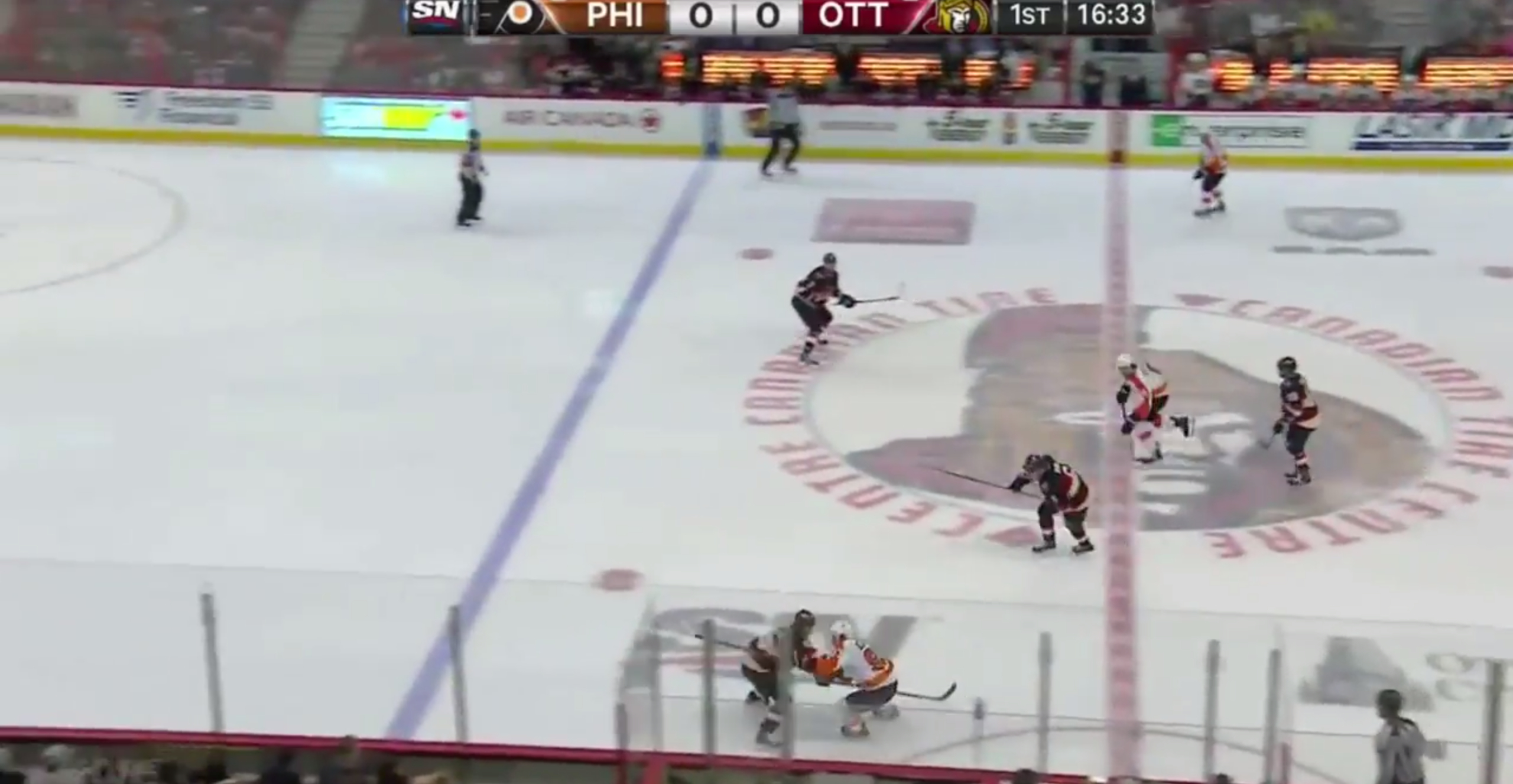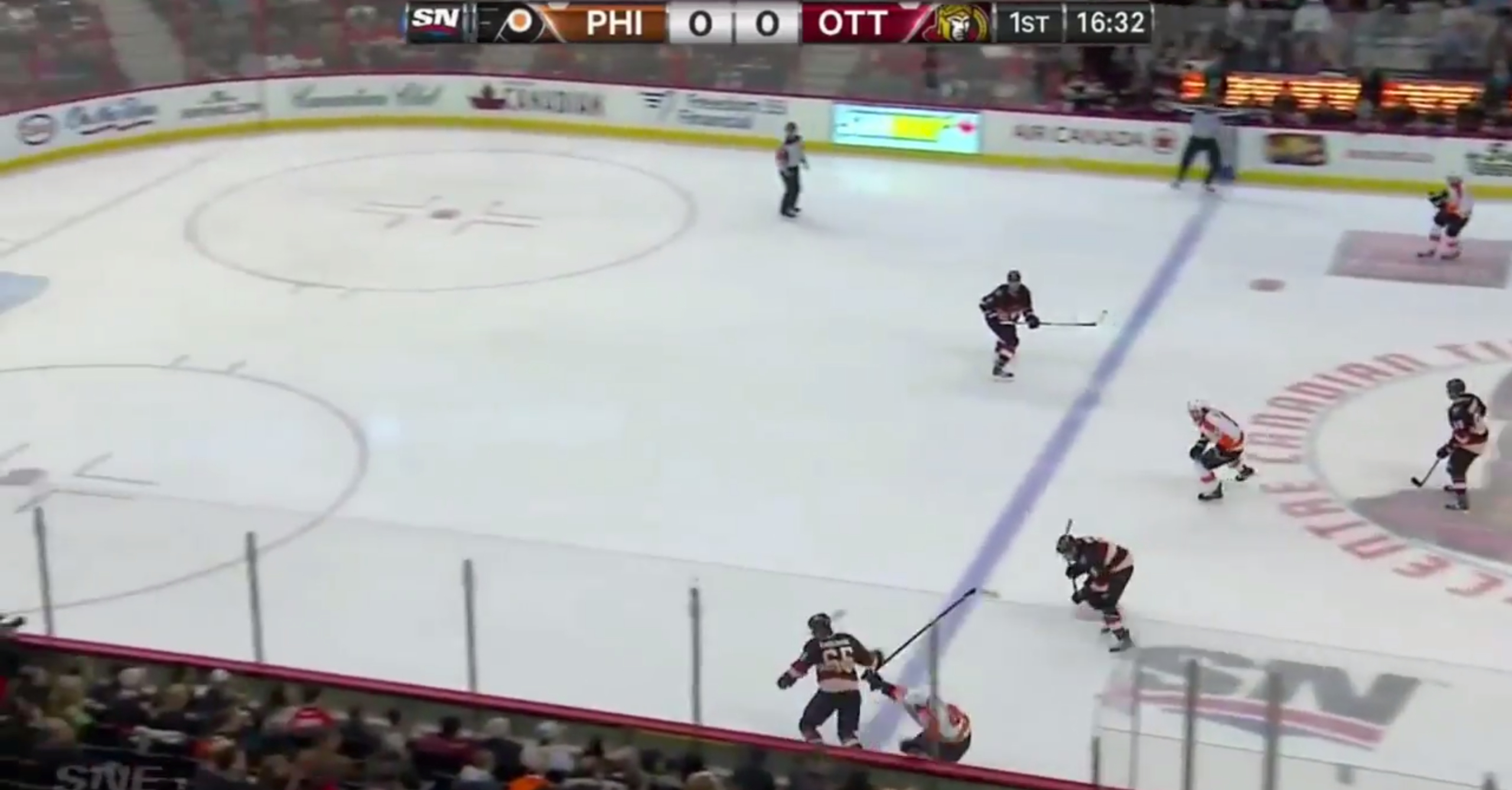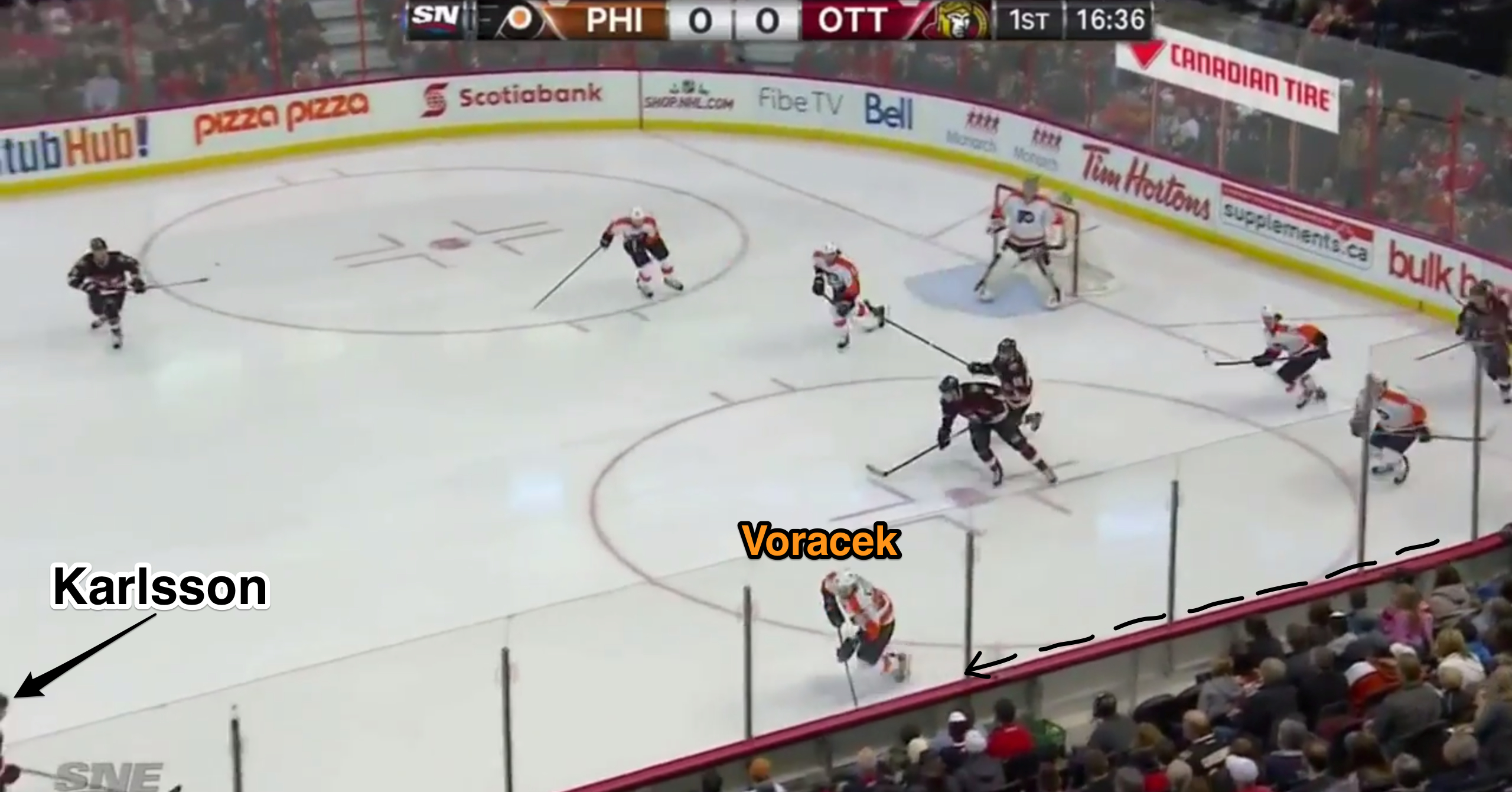 The puck comes up the boards to Jakub Voracek, and he’s off towards the Ottawa end.