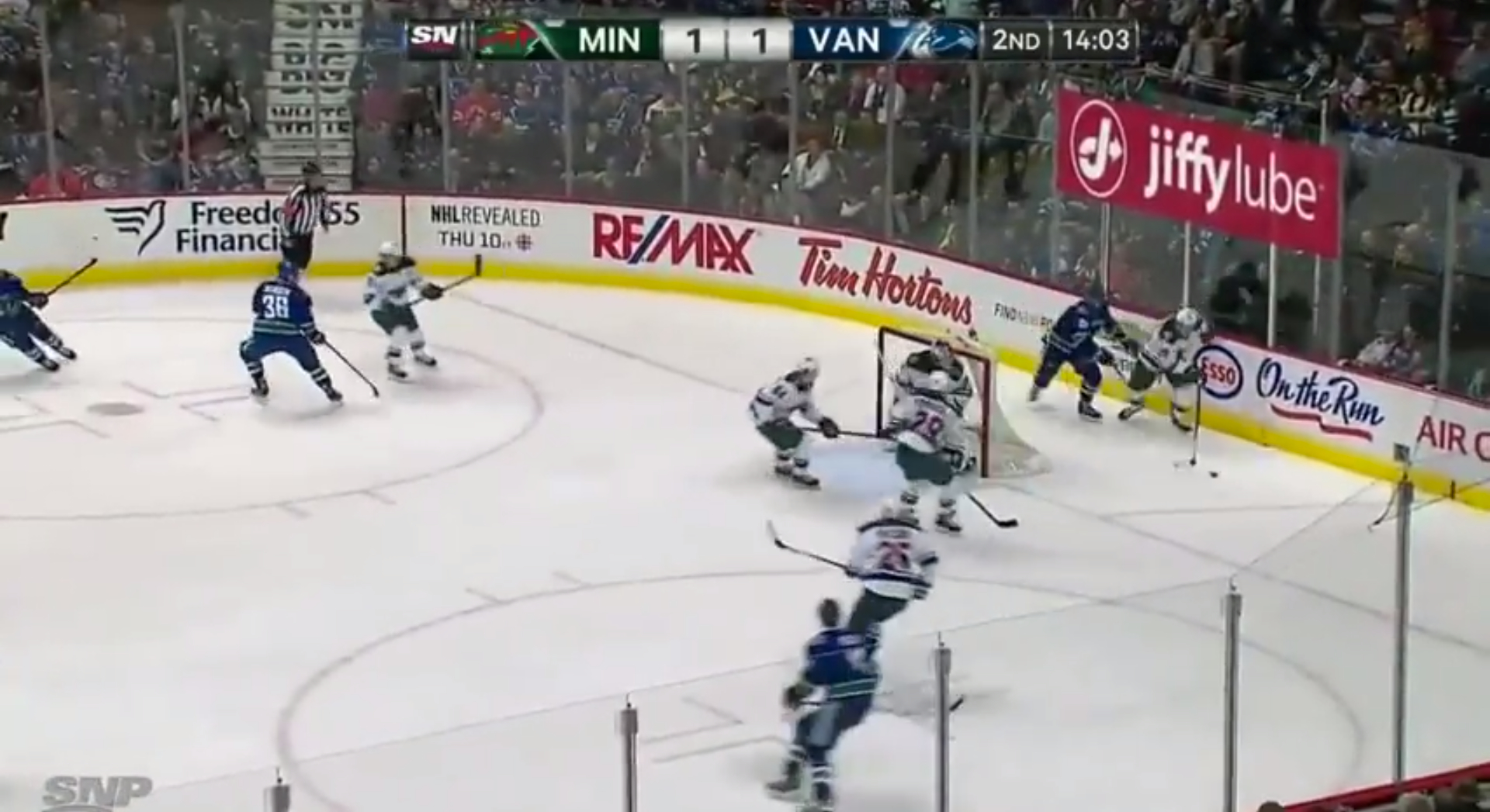 And instead of banging it around the wall, he cuts back, and the Wild are heading out the other way.