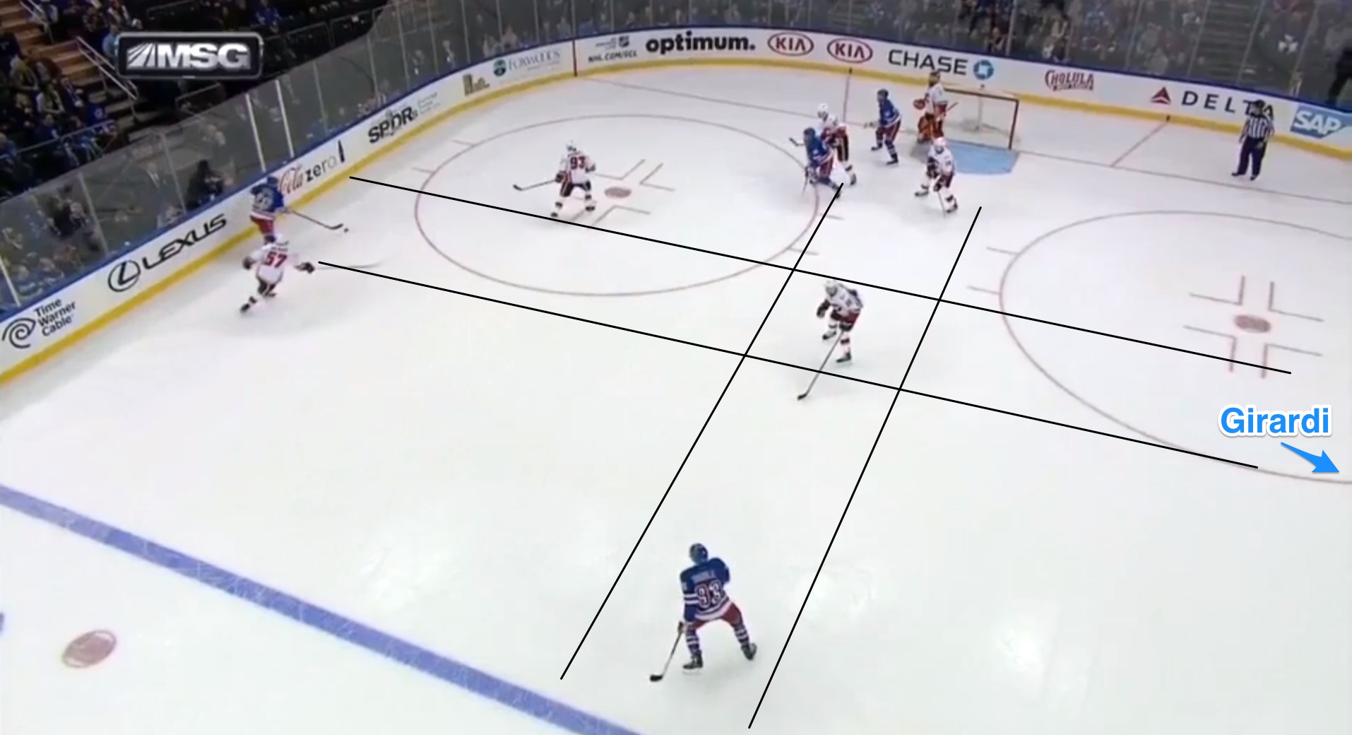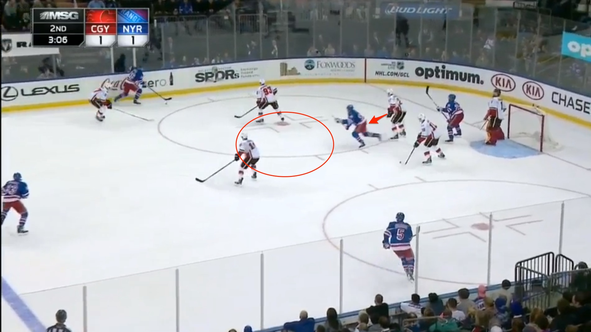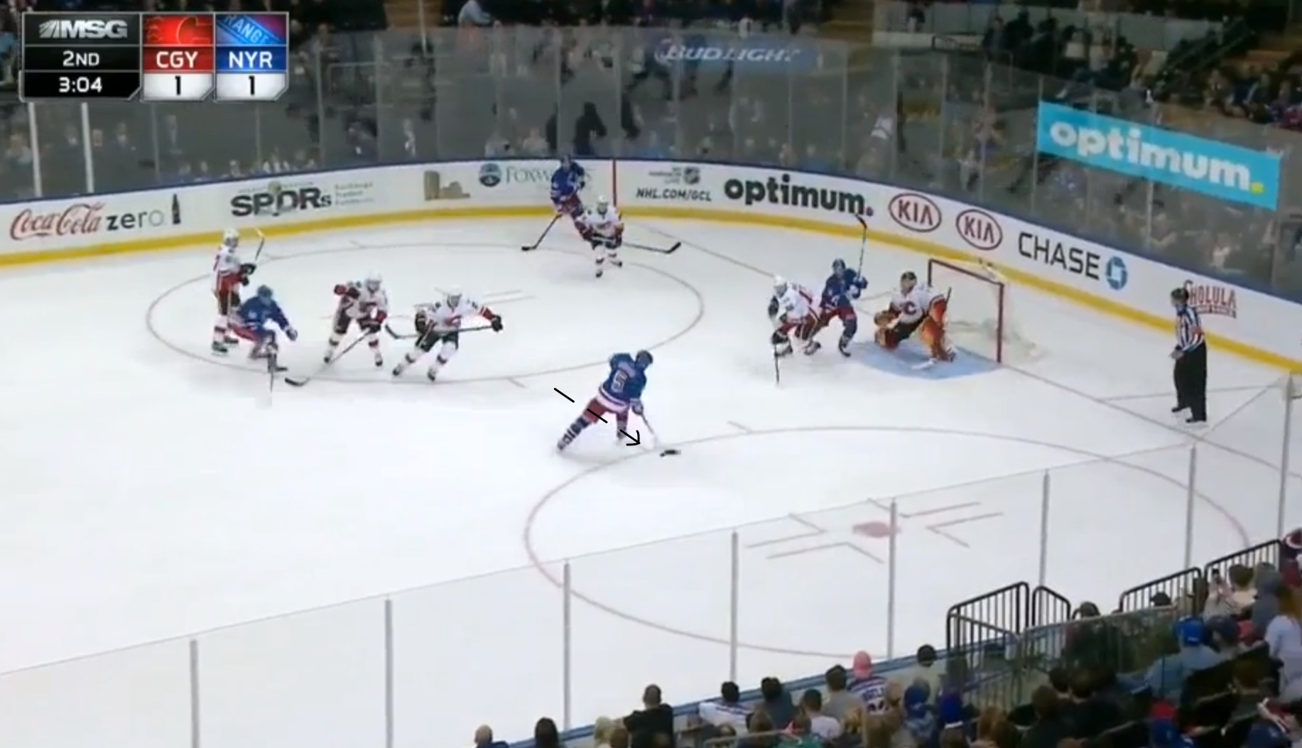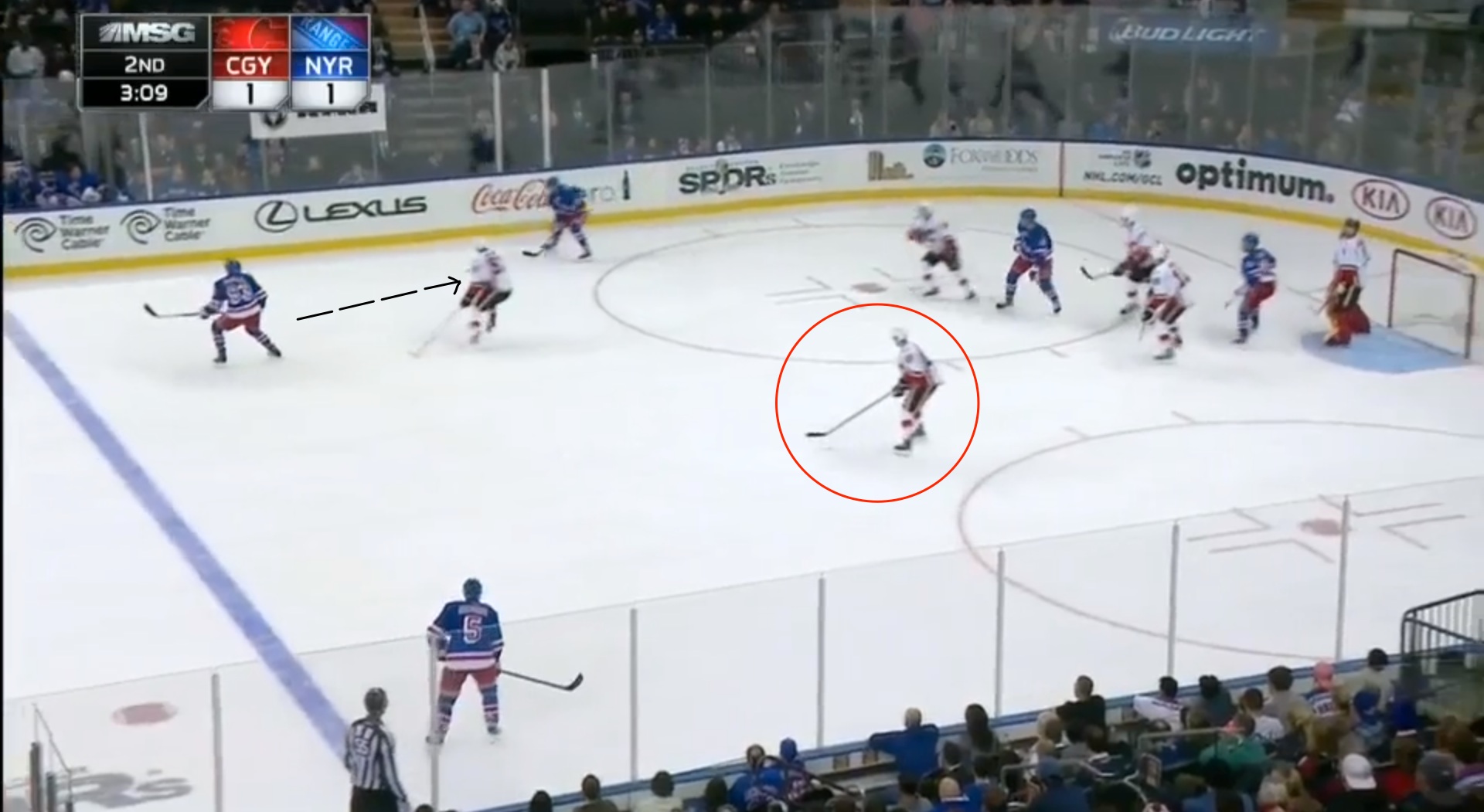 The puck squirts up to Jarret Stoll, the Rangers' third forward who's providing support, but that's fine too - he's on the outside yellow paint, and the Flames have five back. Zero defensive issues so far.