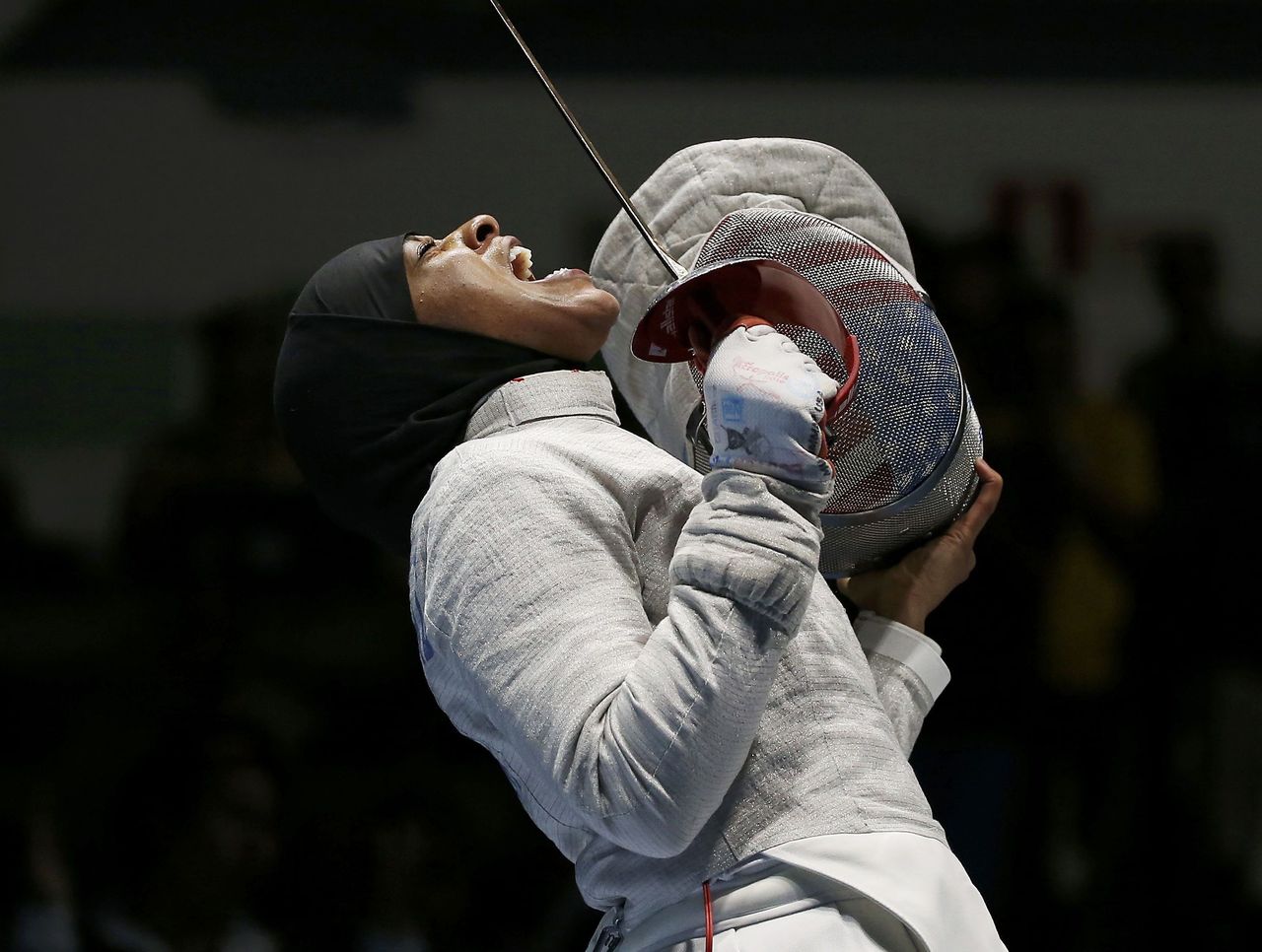 Fencer Ibtihaj Muhammad, the first-ever American Olympian to compete while wearing a hijab, celebrates after helping the United States claim bronze in team sabre.