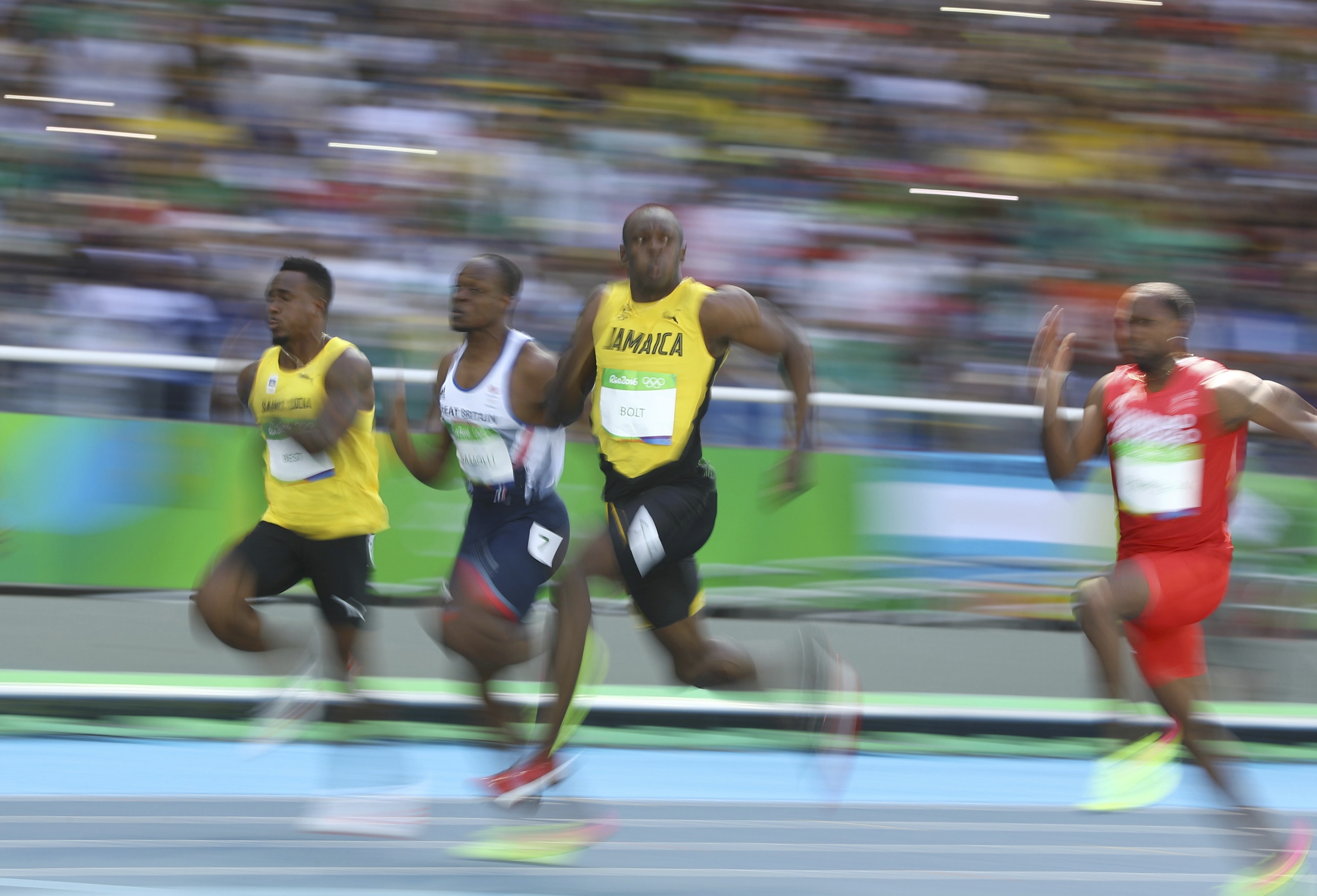 Jamaican track superstar Usain Bolt checks his rearview mirror while breezing into the 100m semifinals with a first-place finish in his preliminary heat.