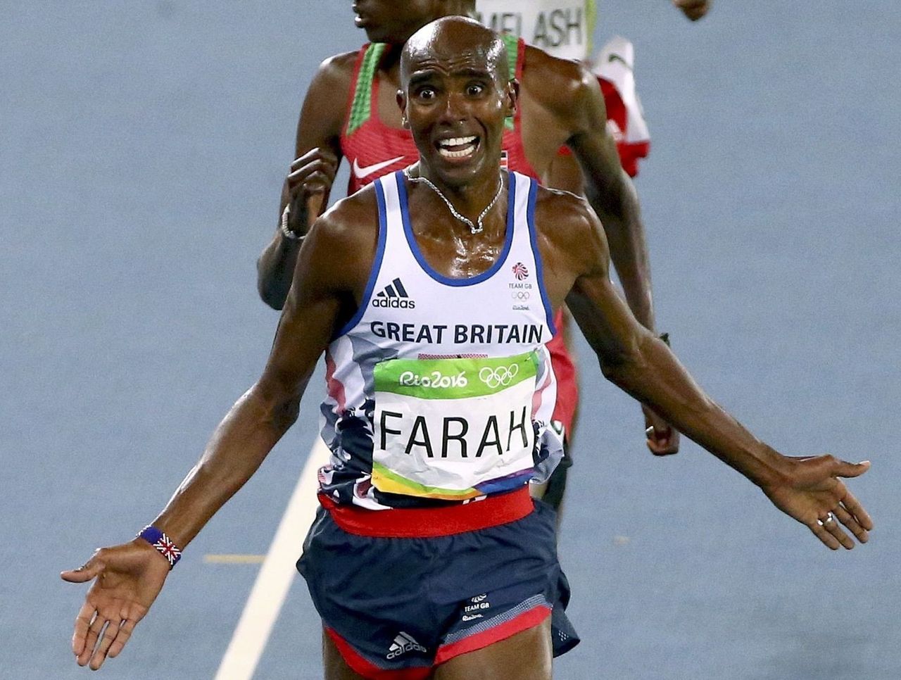Long-distance runner Mo Farah reacts in disbelief as he crosses the finish line to defend his gold medal in the 10,000m event.