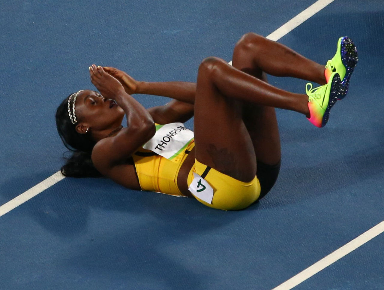 Jamaican sprinter Elaine Thompson prays in celebration after dethroning countrywoman Shelly-Ann Fraser-Pryce to win gold in the 100m final.