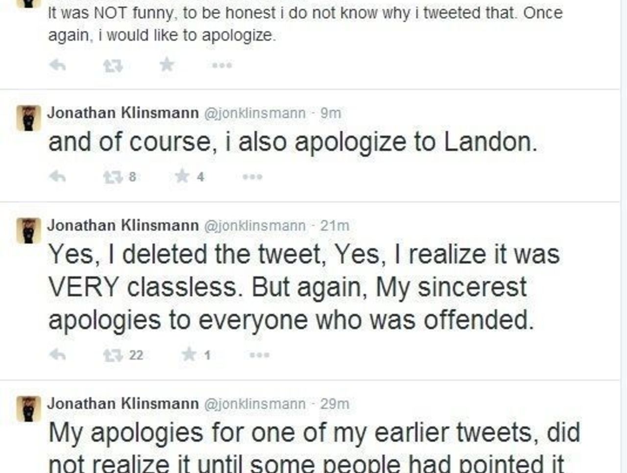 He tweeted (again, his account was deleted not long after this): "Yes, I deleted the tweet, Yes, I realize it was VERY classless. But again, My sincerest apologies to everyone who was offended. and of course, i also apologize to Landon. It was NOT funny, to be honest i do not know why i tweeted that. Once again, i would like to apologize."
