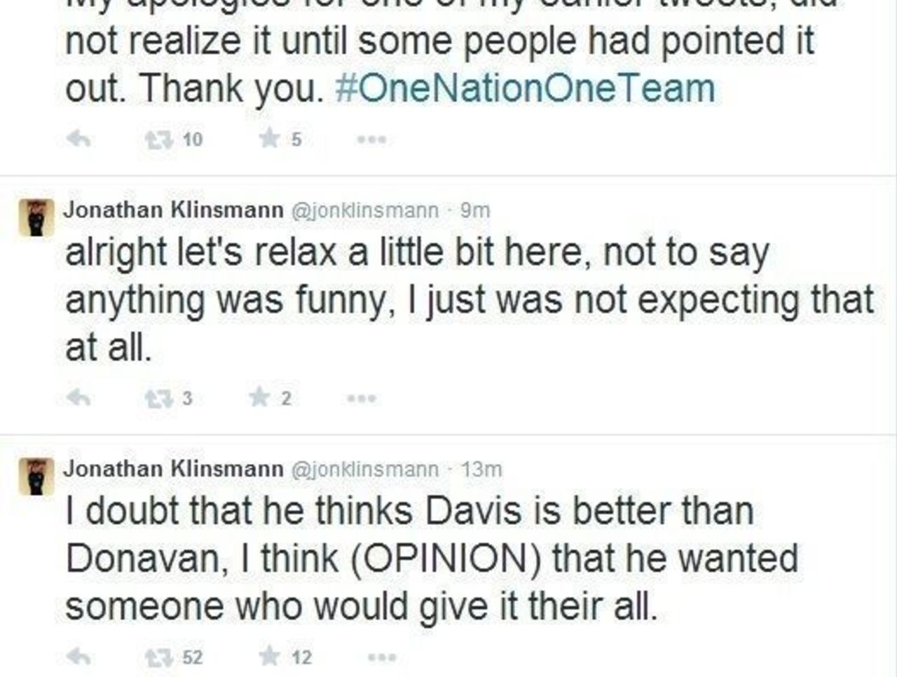 Klinsmann's son wrote this then deleted: RT @jonklinsmann HHAHAHAHAHAHAH DONAVAN HAHAHAHAA I DIDNT EVEN NOTICE UNTIL PHONE NOTIFIED ME HAHA