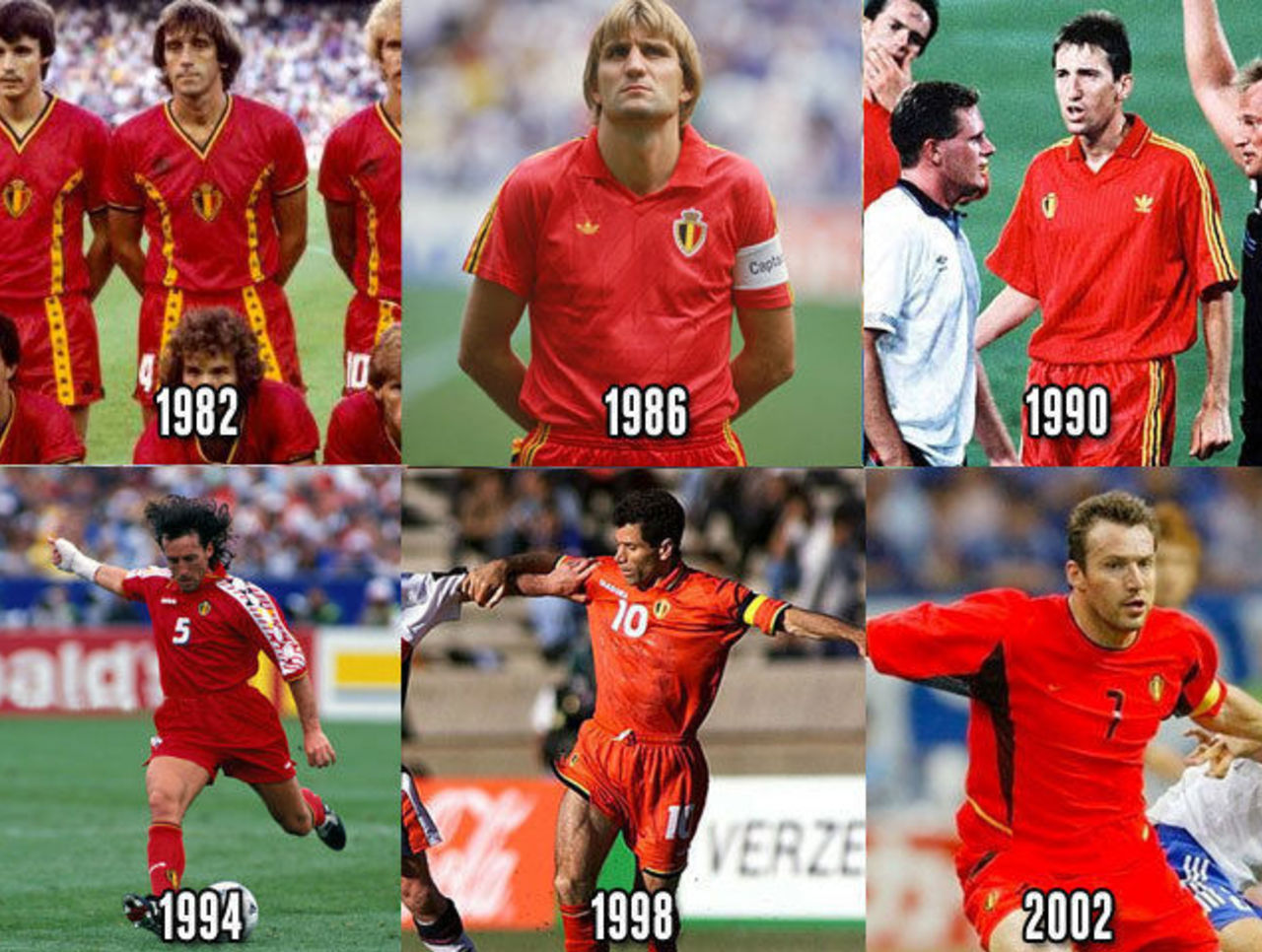 Belgium hasn't qualified since 2002 before this year, back then when they were partnered with Nike they still wore red primaries and black secondaries. Their most bold design was perhaps from 1982 when they wore a red jersey with two yellow arches featuring tiny black crowns throughout.