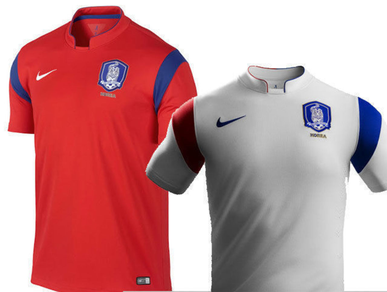 Nike's designs for South Korea are very much like the standard design the Koreans have been wearing outside World Cup play, one of the few teams to get this treatment. They'll be wearing red jerseys as their primary kit, blue stripes looping around under each arm over across the shoulders. Inside the collar is a calligraphic symbol representing a "fighting spirit".