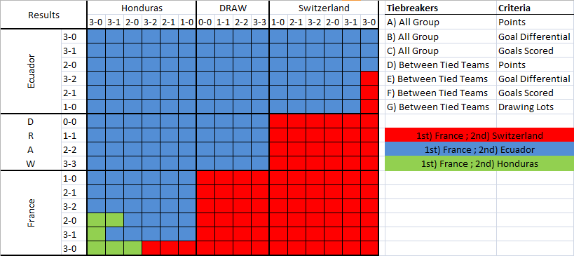 Honduras has to not only beat Switzerland, but also hope that France beat Ecuador. Their win over the Swiss would have to be significant enough to erase their awful goal differential in the process.