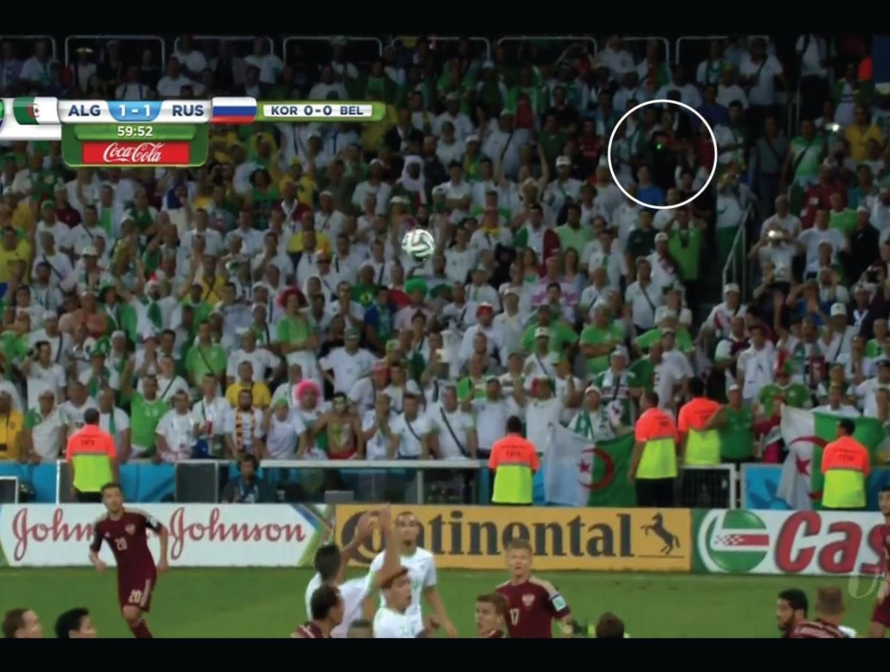 But when televisions showed the reverse angle of Algeria's equalizing goal, they appear to have captured the suspect who was pointing a green laser into the eyes of Russian keeper.