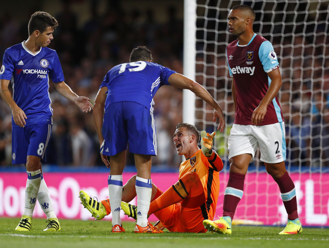After Adrian messed around with the ball inside his own penalty area, Costa closed down the Spanish 'keeper, resulting in a studs-on-shin tackle that left the shot-stopper in obvious pain. West Ham's players appealed for Taylor to dismiss the native of Brazil, who was already on a yellow, but no cards were pulled out of the referee's pocket.