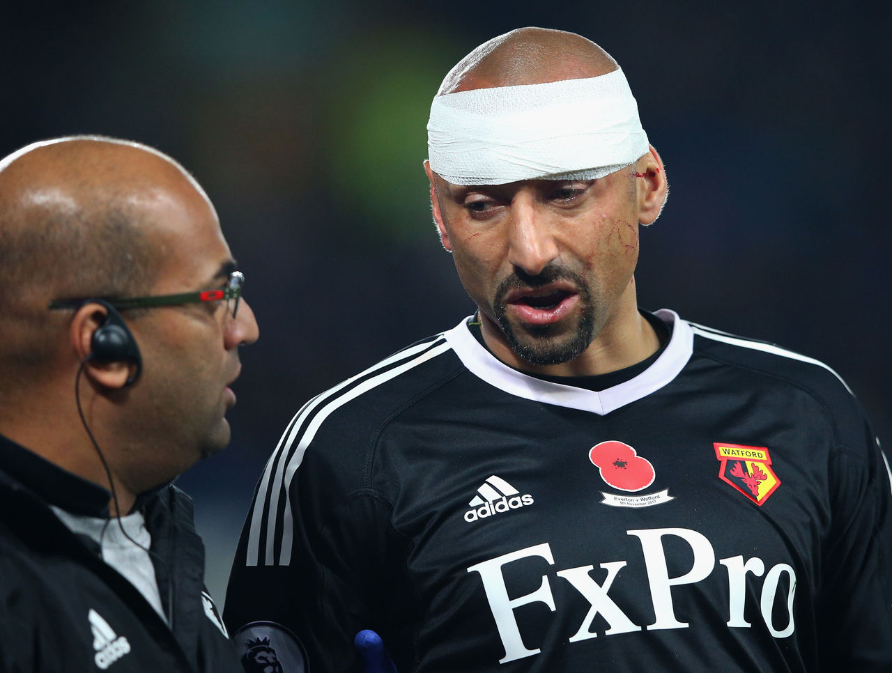 59' - Watford goalkeeper Heurelho Gomes looks groggy after being caught in a tangle of legs. The Brazilian is bandaged up but eventually withdrawn when blood is pouring down his face. Backup Orestis Karnezis appears from the bench for his English debut.