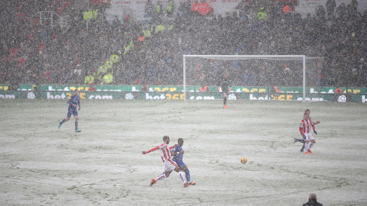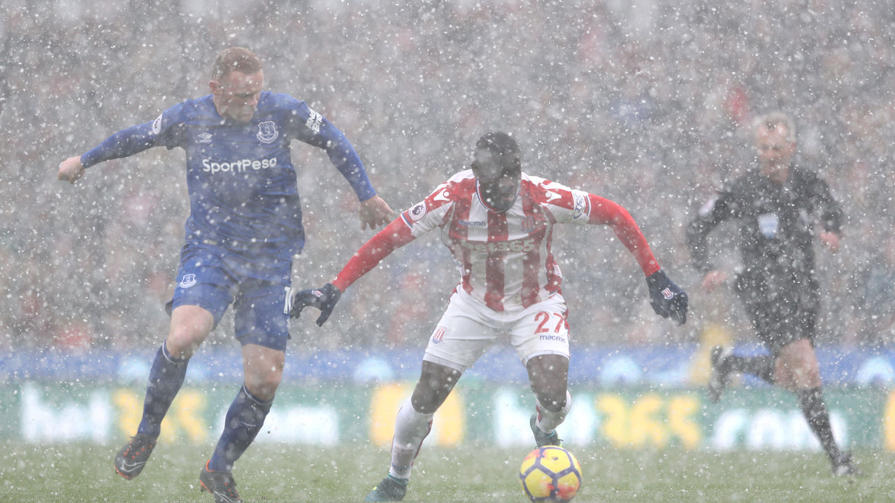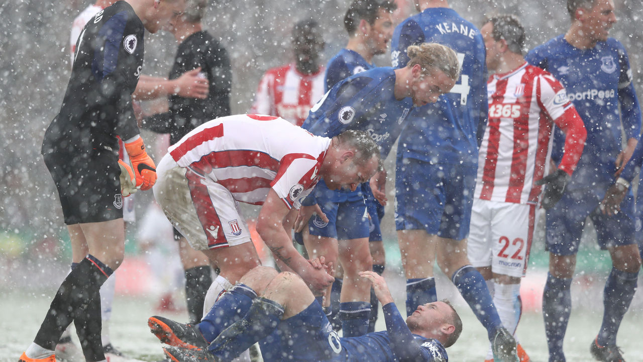 Look: Slip and slide as snow carpets Stoke City, Everton match