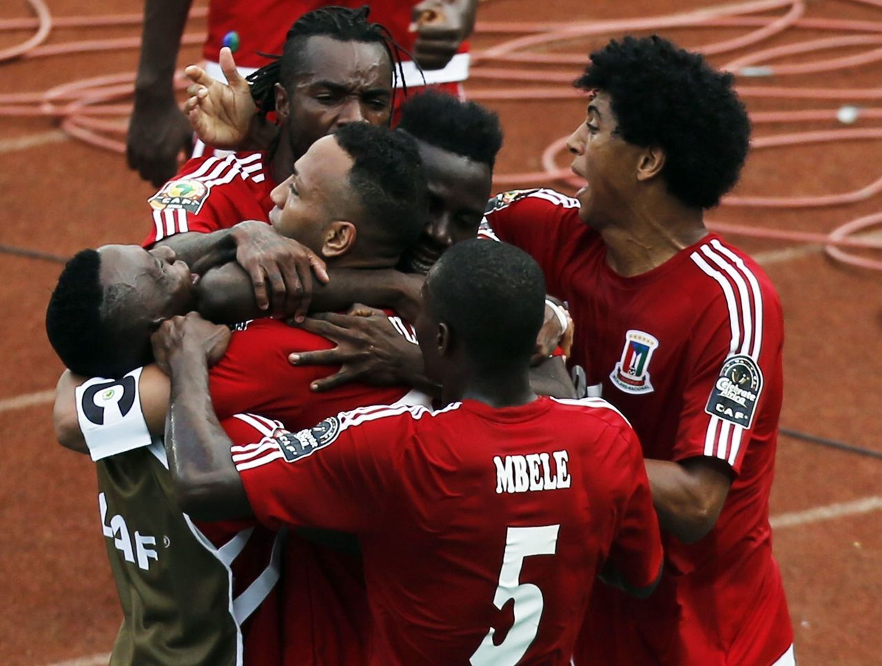 Equatorial Guinea's Emilio Nsue celebrates with his teammates after scoring the tournament's first goal