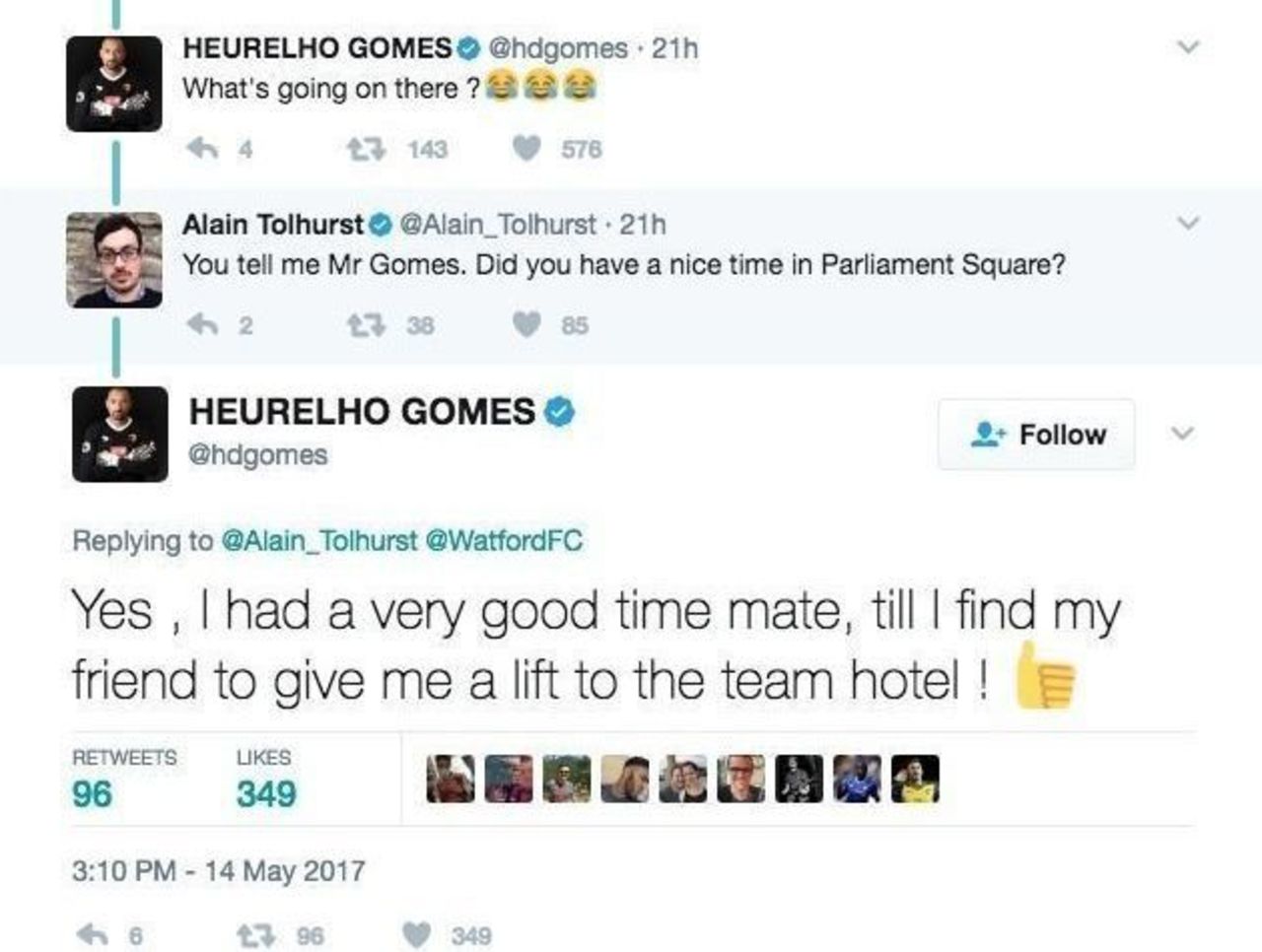 By golly, that is Watford first-choice shot-stopper Heurelho Gomes hanging out near Parliament Square on Sunday sporting his Hornets' colours. This begs two questions: why, and if you tag a footballer on Twitter, will he actually check his mentions?