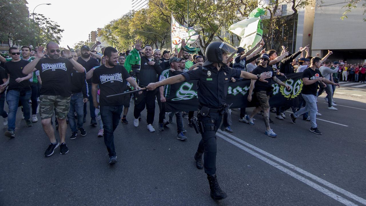 People were socializing outside the pena. There was occasional singing above a buzz of anticipation for El Gran Derbi, which was just an hour away. A few streets away, the Betis fans' gauntlet walk to the stadium could be seen. The pena patrons whistled and jeered, but nothing more.