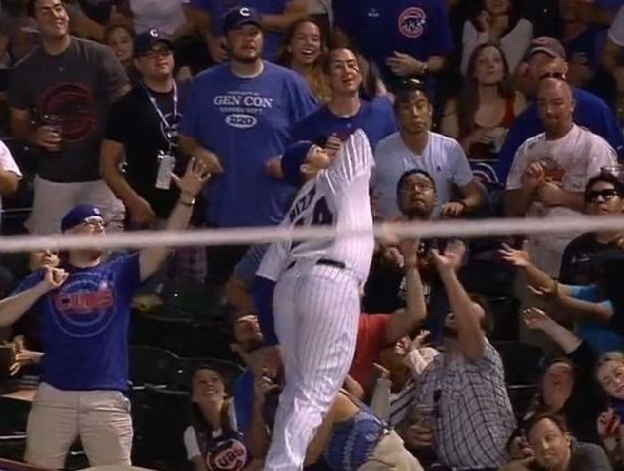 Rizzo is making a name for himself with his balancing acts. Not only did he make an exceptional play Tuesday due to his steadiness, he managed a similar grab in 2015 with the aid of the tarp at Wrigley Field.