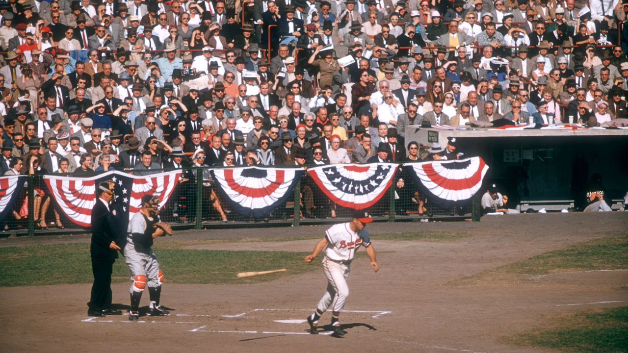 The Braves' lone title during their abbreviated stay in Milwaukee came in a seven-game thriller over the Yankees. When Warren Spahn struggled, right-hander Lew Burdette picked up the slack and earned Series MVP honors with a 0.67 ERA and three complete-game victories - including shutouts in Games 5 and 7. Hank Aaron hit .393 (11-for-28) with three homers and seven RBIs. - Sharkey-Gotlieb
